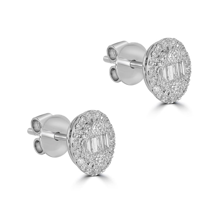 18K White Gold Oval Stud Earrings With Natural Baguette Diamond