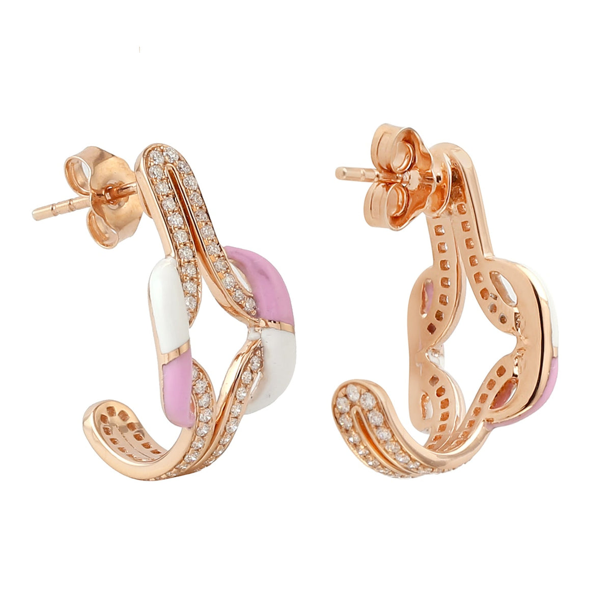 18K Rose Gold Enamel Designer Hoop Earrings With Pave Diamonds