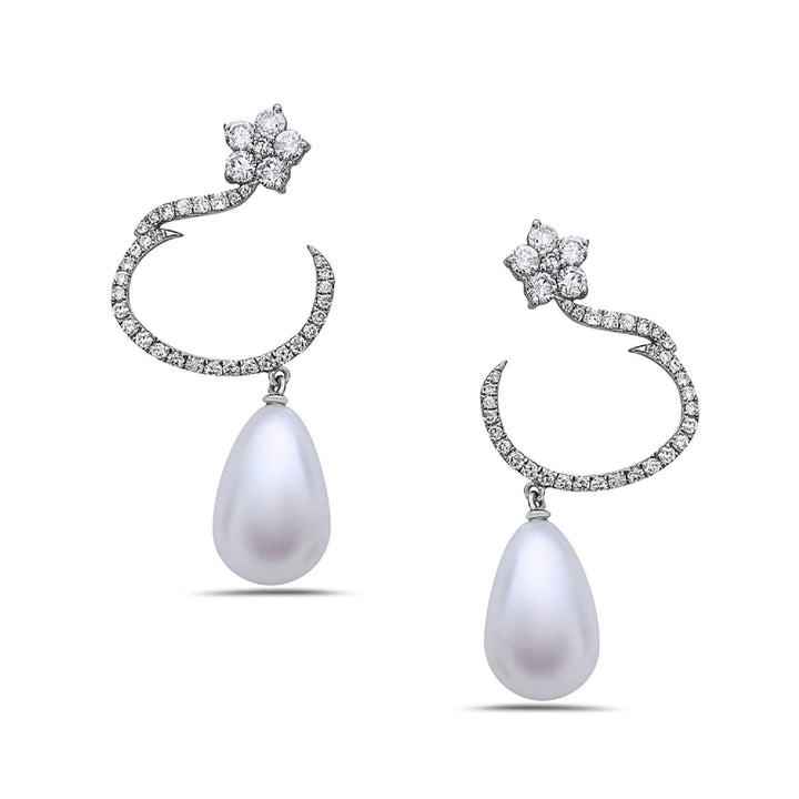 These handcrafted dangle earrings are made from 18k rose gold. They feature natural pearls and 2.27 carats of natural diamonds.