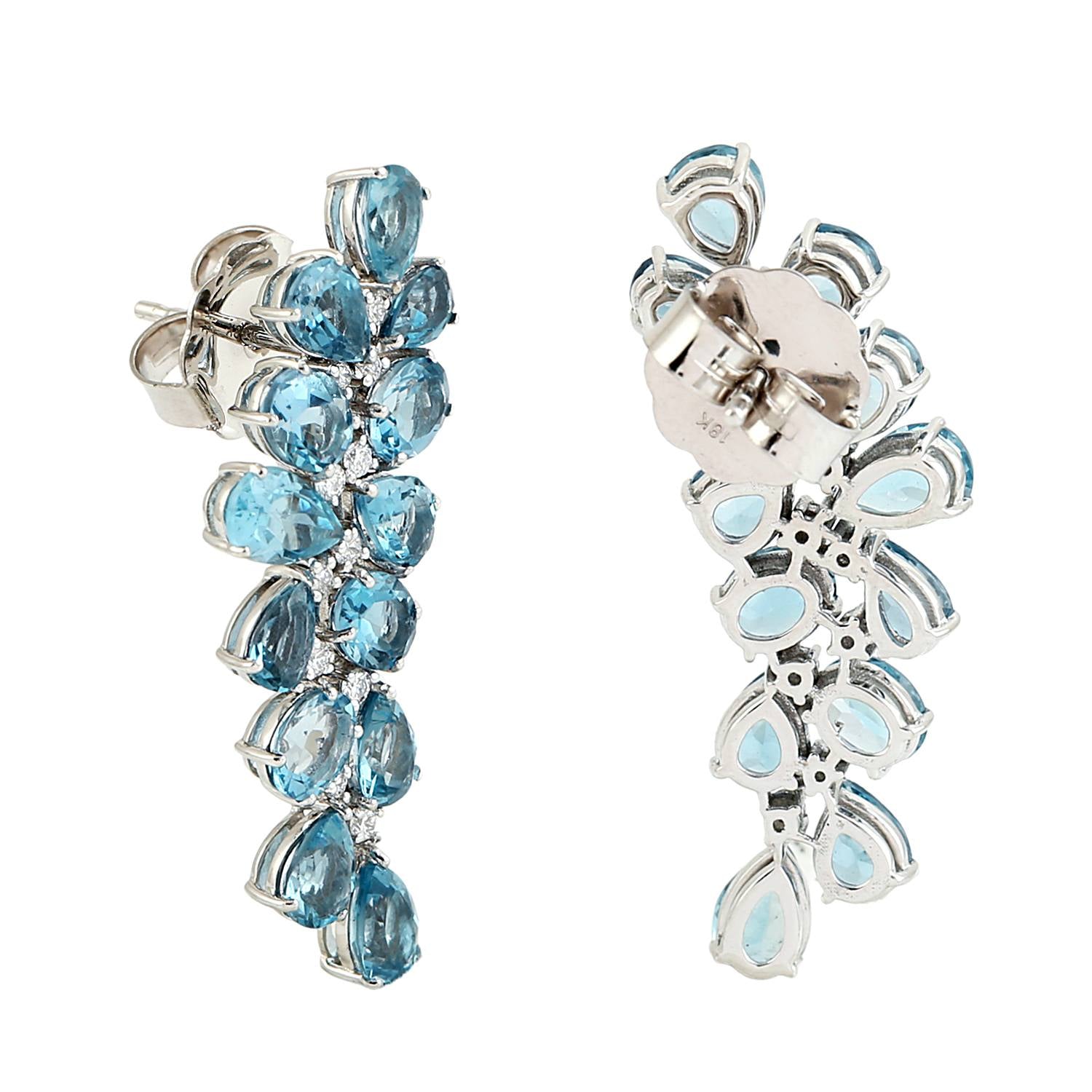 These earrings are handmade in 18k solid white gold, featuring 9.9 carats of blue topaz and 0.32 carats of natural diamonds.