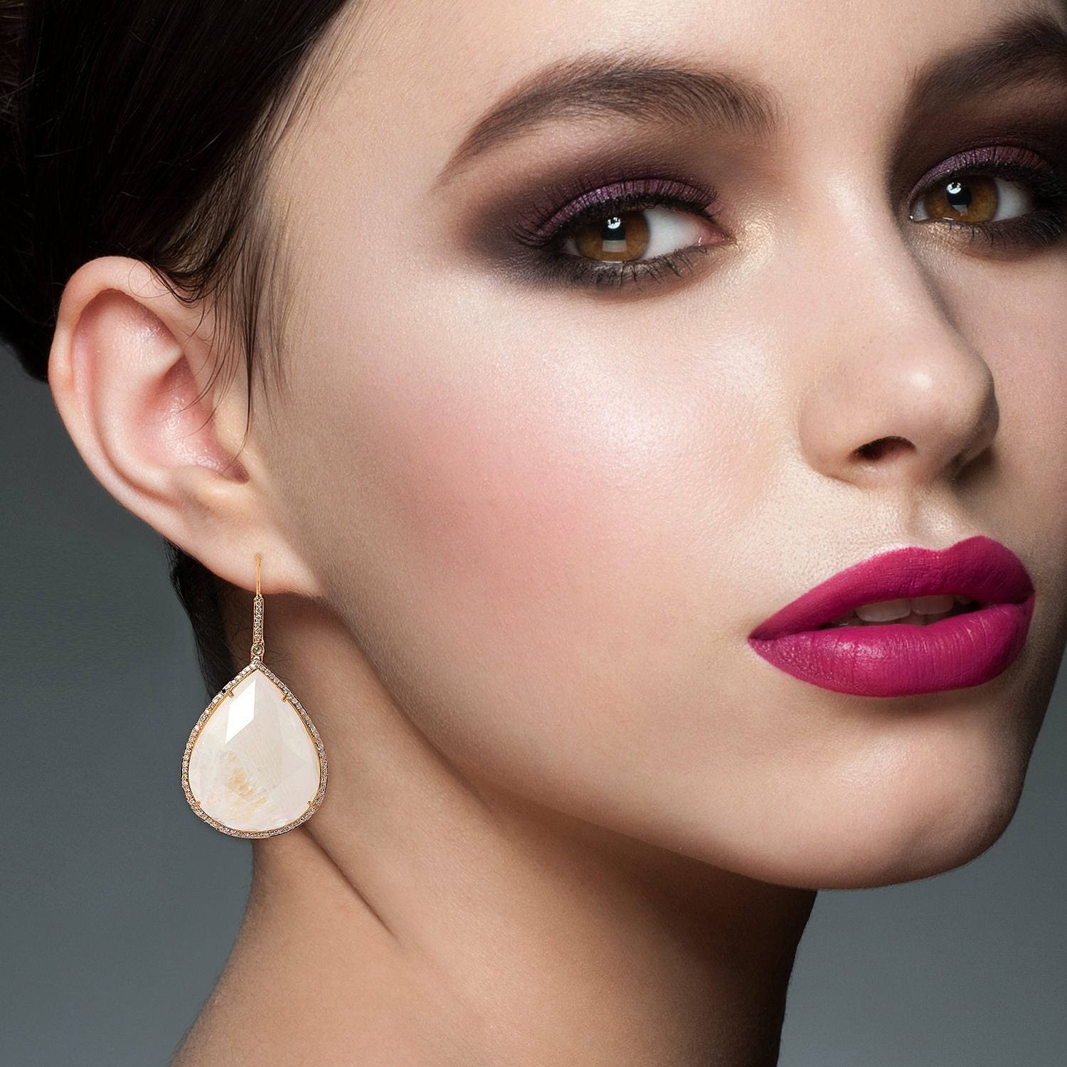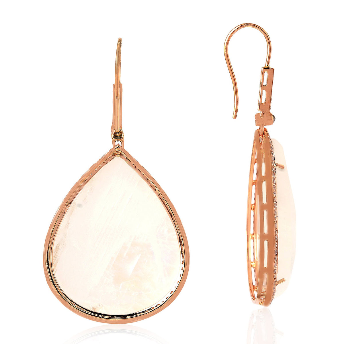 These handcrafted ear hook earrings are made from 18k rose gold. They feature 99.70 carats of moonstone and 1.01 carats of natural diamonds.