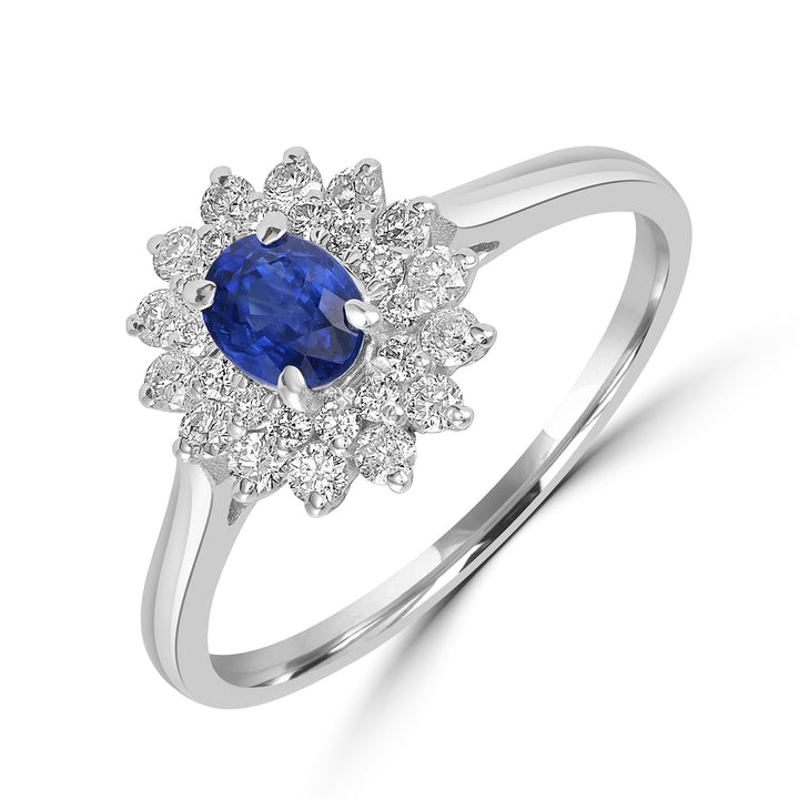 18K White Gold Prong Blue Sapphire & Diamond Flower Design Ring