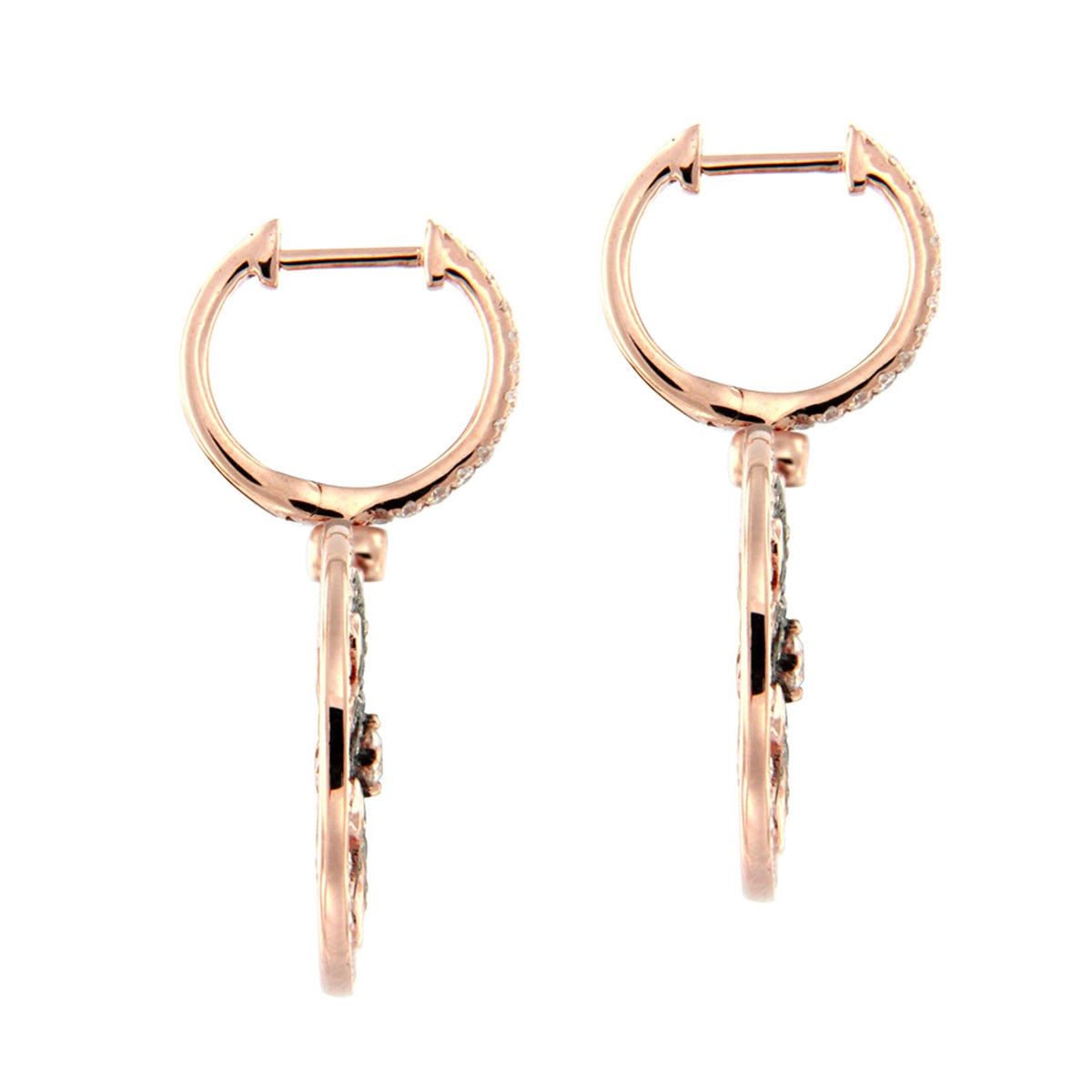 These handcrafted drop earrings are made from 14k rose gold. They feature 1.038 carats of brown and white diamonds.