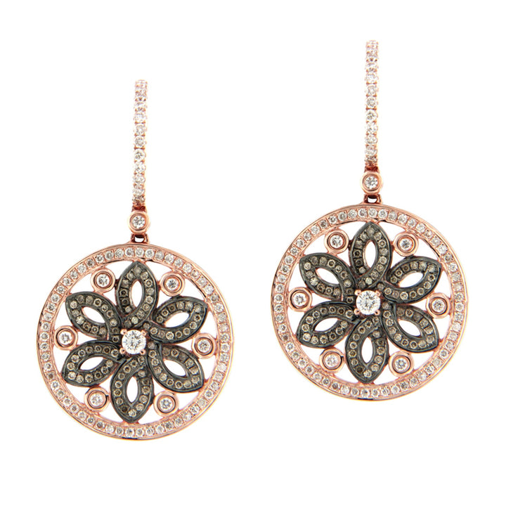 Rose Gold Floral Medallion Drop Earrings With Brown & White Diamond