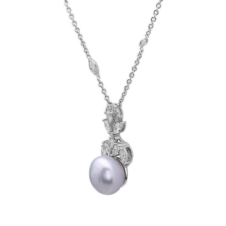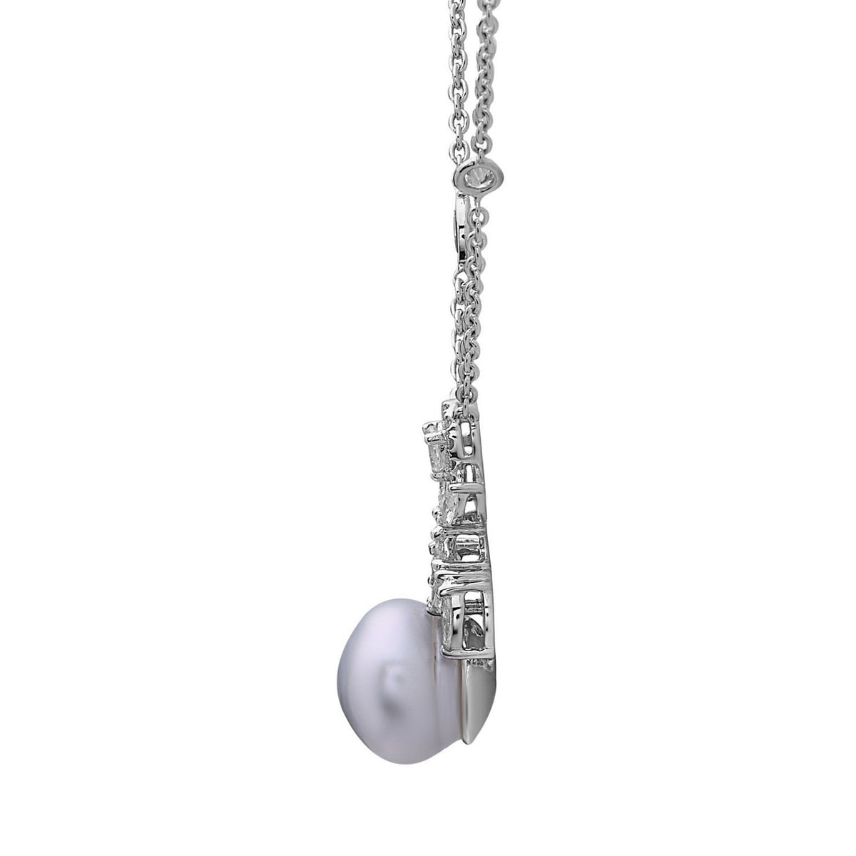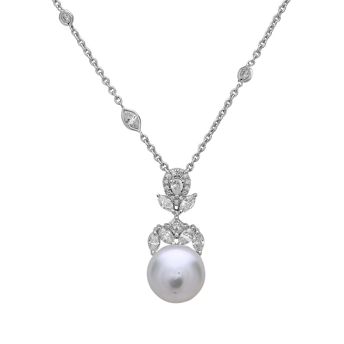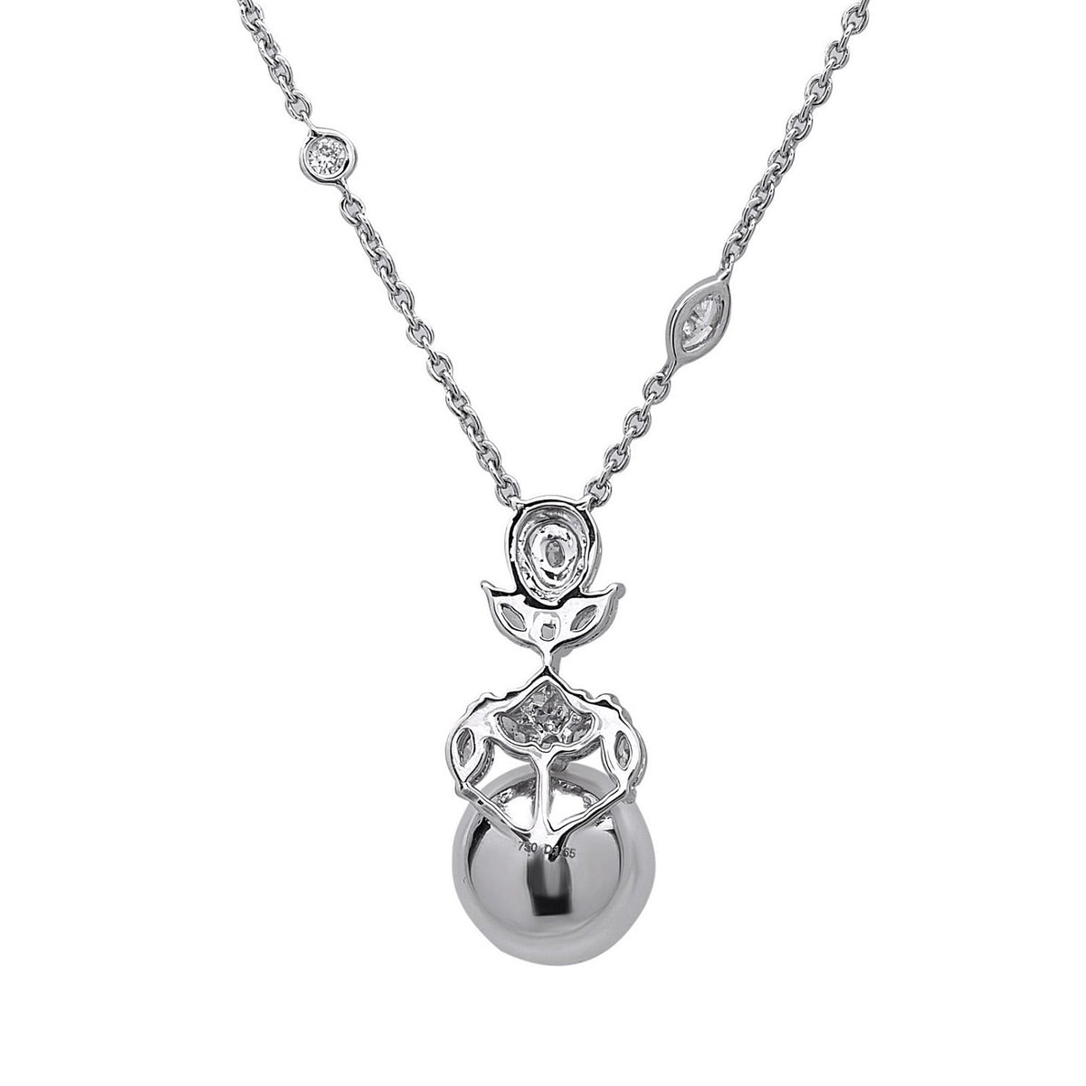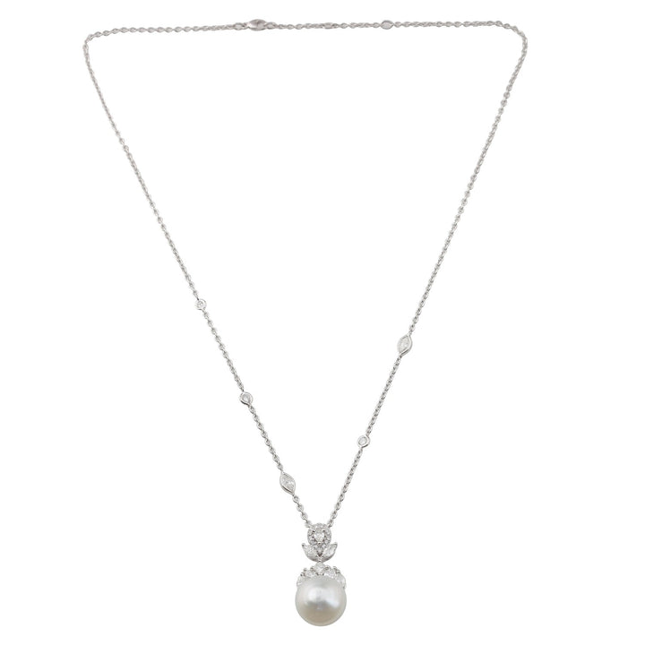 This handmade necklace is crafted in India from 18k white gold. It features 1.64 cts of natural diamonds and a 15.16 cts natural pearl.