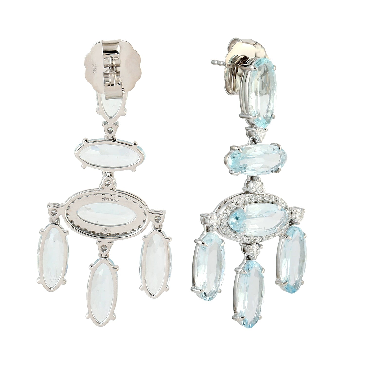 These chandelier earrings are handmade in 18k solid white gold. They feature 12.77 carats of natural aquamarine and 0.74 carats of natural diamonds.