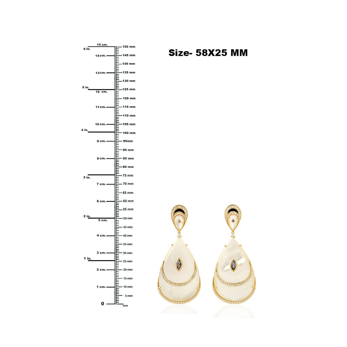 These handmade dangle earrings are crafted from 18k white gold. They feature 0.99 cts of natural diamonds, 48.38 cts of mother-of-pearl, and 0.52 cts of iolite.