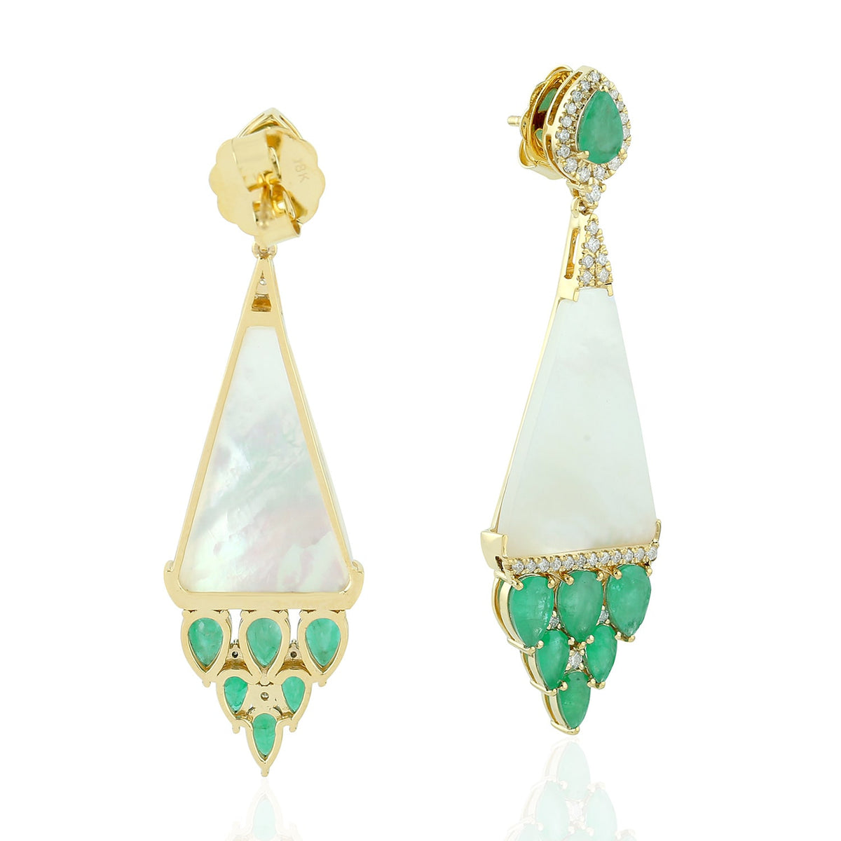 These handmade dangle earrings are crafted from 18k yellow gold. They feature 0.56 cts of diamonds, 11.54 cts of mother-of-pearl, and 4.15 cts of emeralds.
