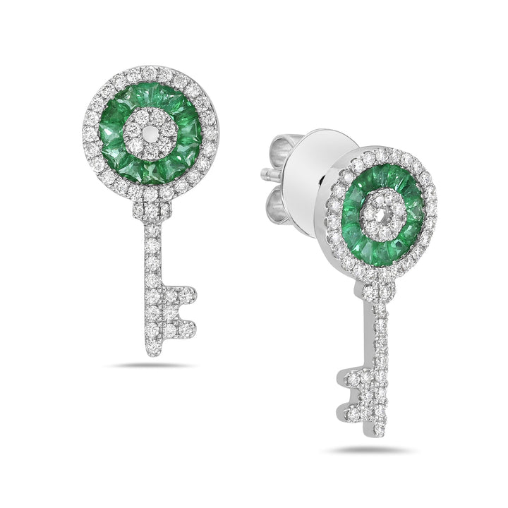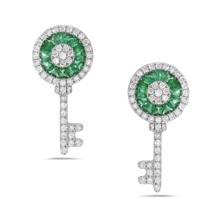 Natural Emerald & Diamond Key Dangle Earrings In White Gold