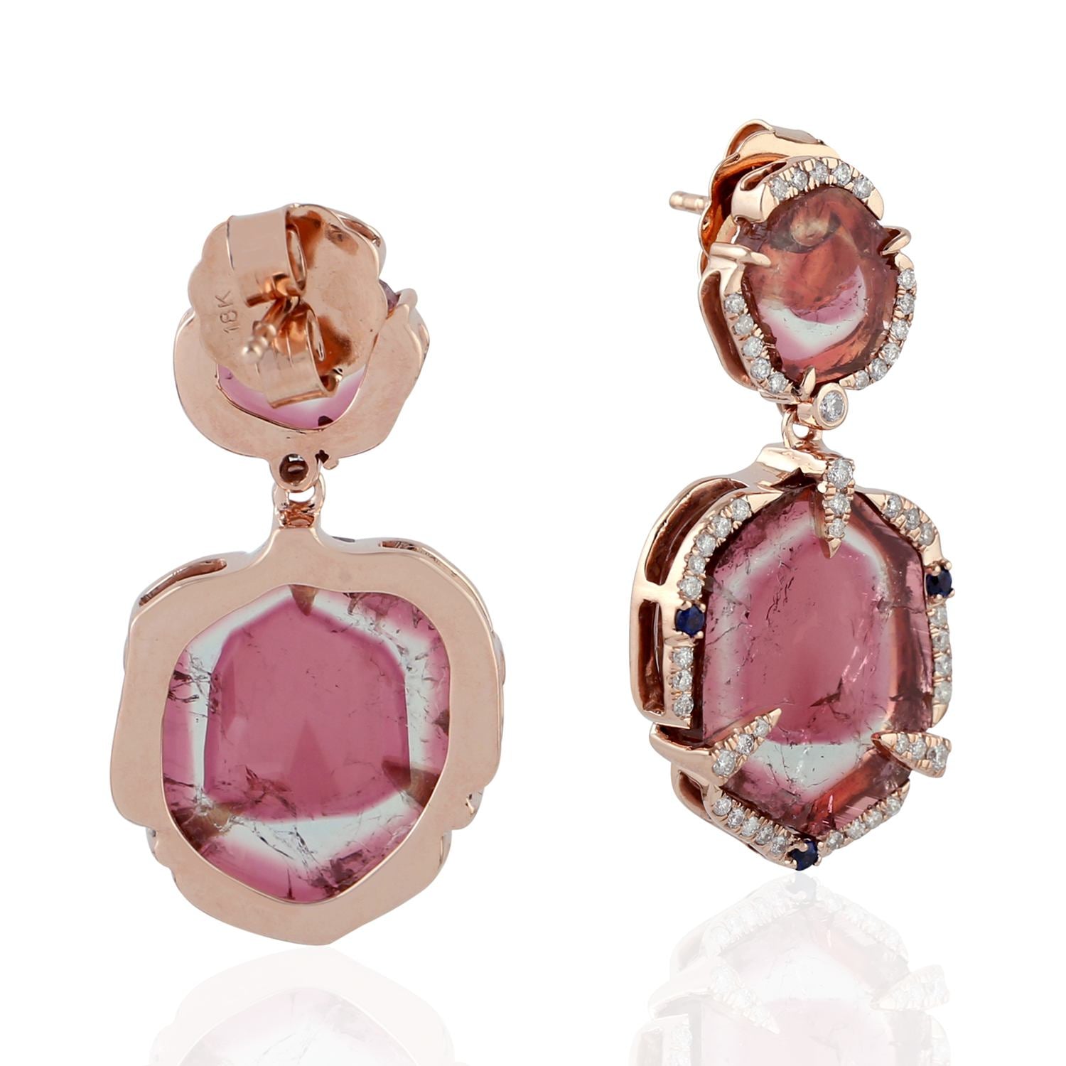 Tourmaline Melon & Blue Sapphire Diamond Dangle Earrings In Rose Gold