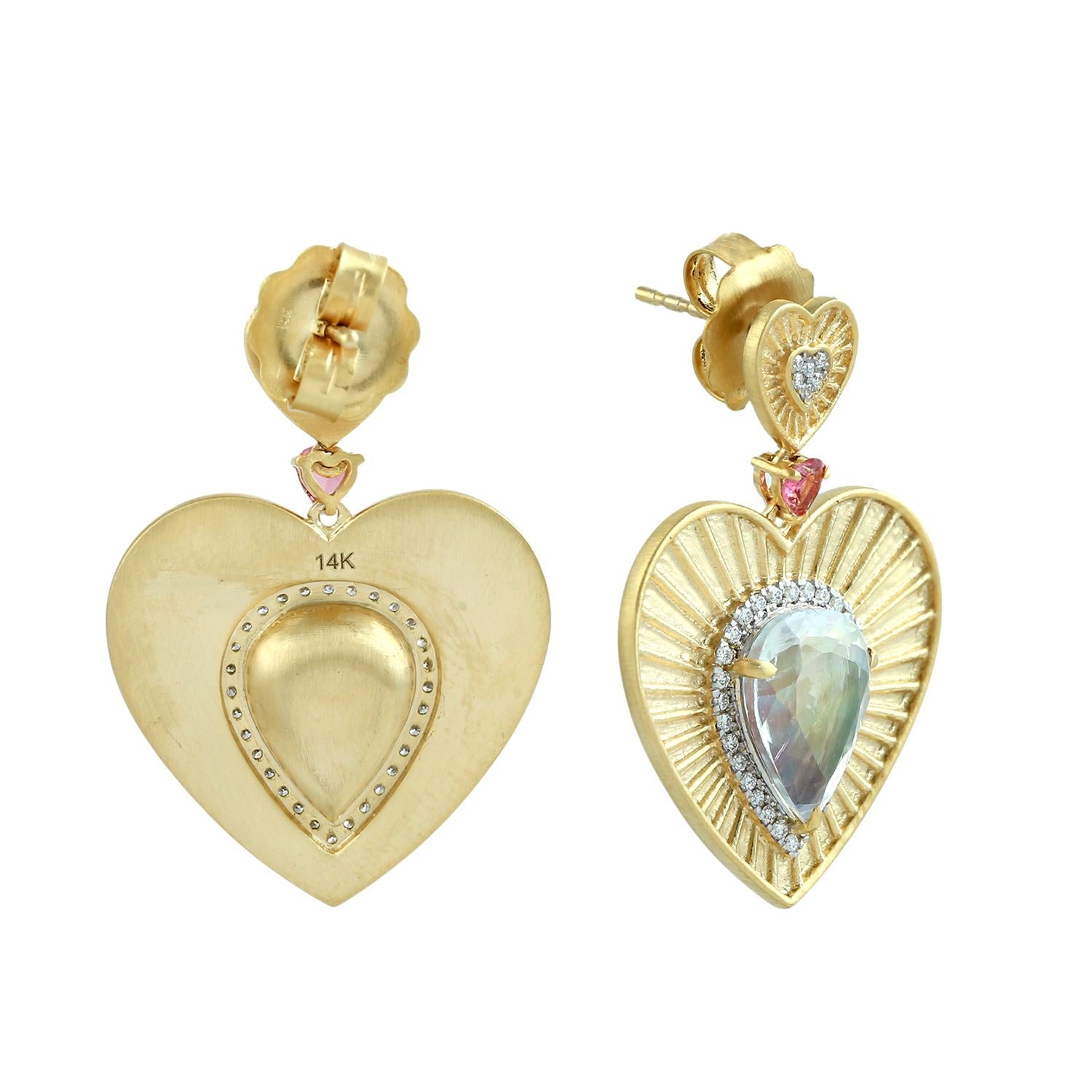 These Moonstone Blue & Pink Tourmaline Pavé Diamond Heart Dangle Earrings by Artisan are a modern piece of fine jewelry. They are handmade in 14k Yellow Gold and feature a beautiful combination of moonstone blue, pink tourmaline, and pavé diamonds. These earrings are capable of reflecting light to create a natural glow.
