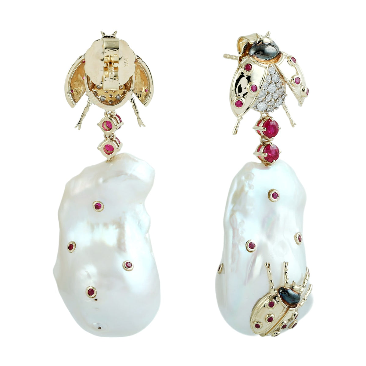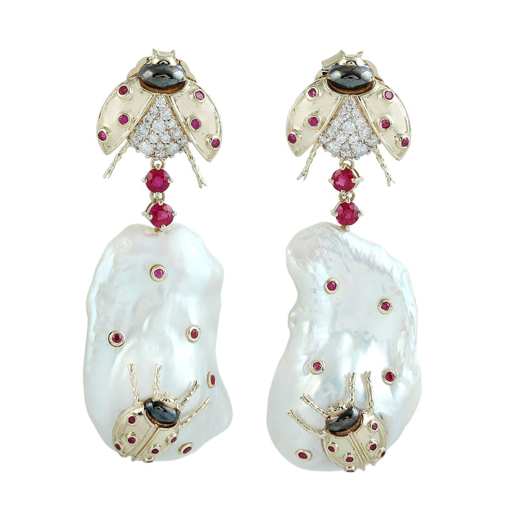 Pearl Chinese & Ruby Gemstone Pave Diamond Insect Dangle Earrings In Gold