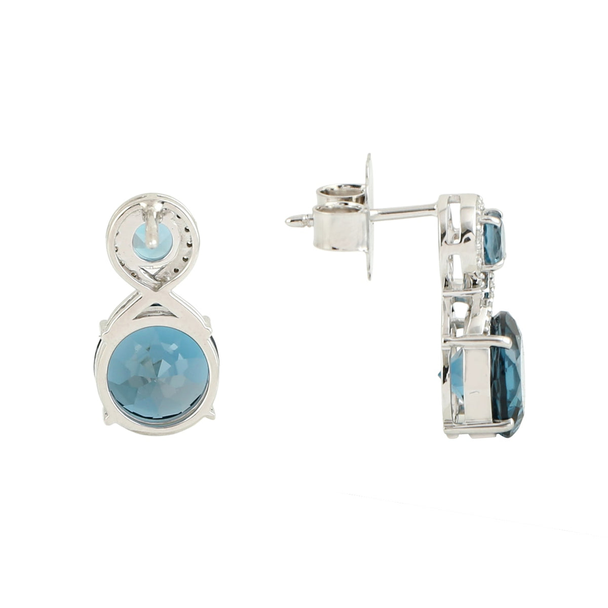 These earrings are handmade from 14k white gold, featuring 7.35 cts of London topaz and 0.18 cts of natural diamonds.