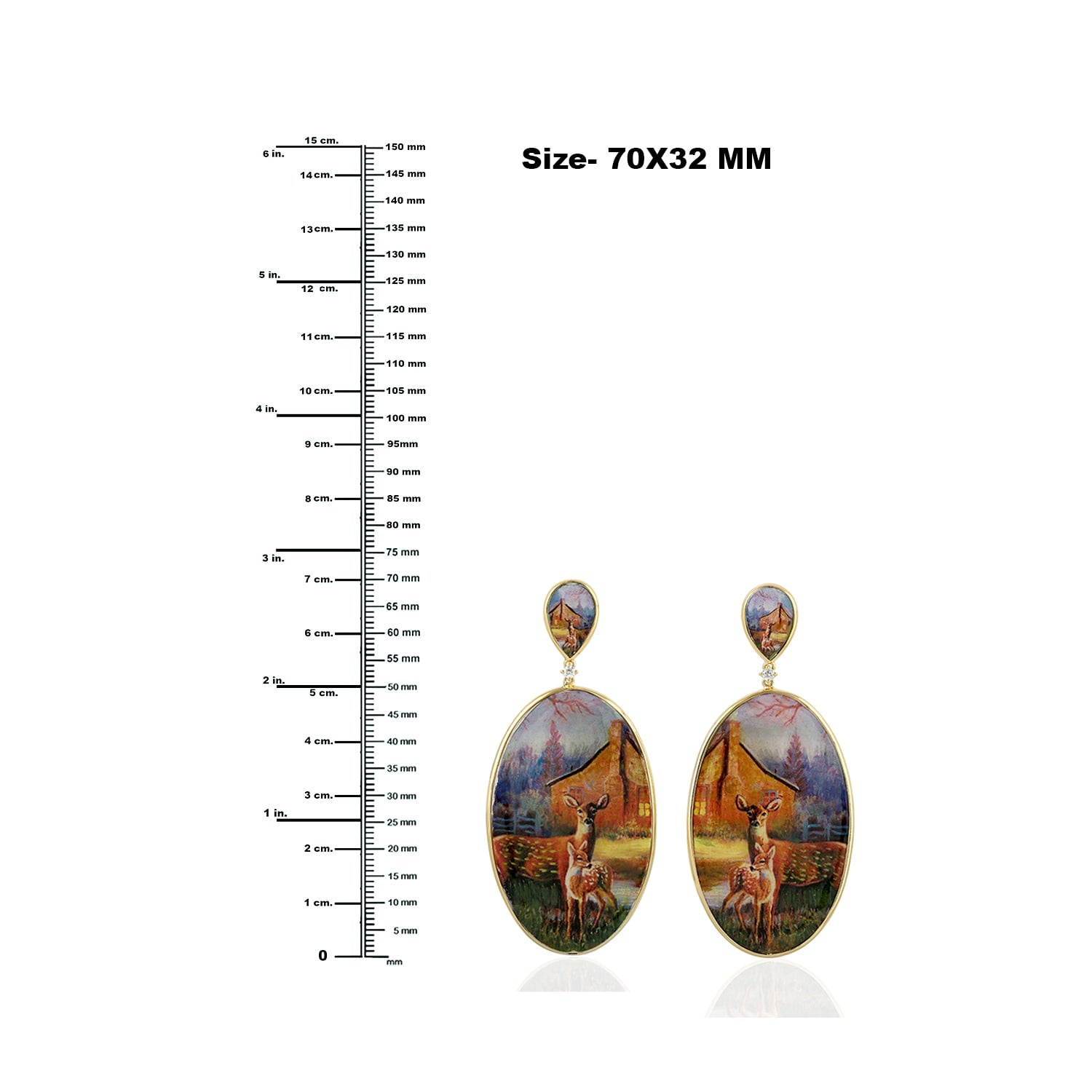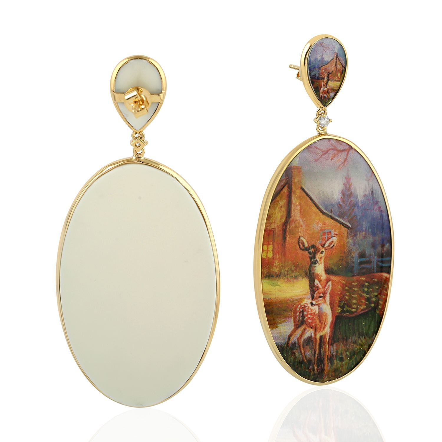 These Picture Bakelite & Diamond Enamel Dangle Earrings in Yellow Gold by Artisan blend vintage charm with modern sophistication. Large, glossy Bakelite elements glow with a soft radiance, accented by sparkling diamonds and enamel for luminous detail. The dangle silhouette adds graceful movement, while the handcrafted 18k yellow gold setting elevates the piece into a statement of artistic refinement and luxury.