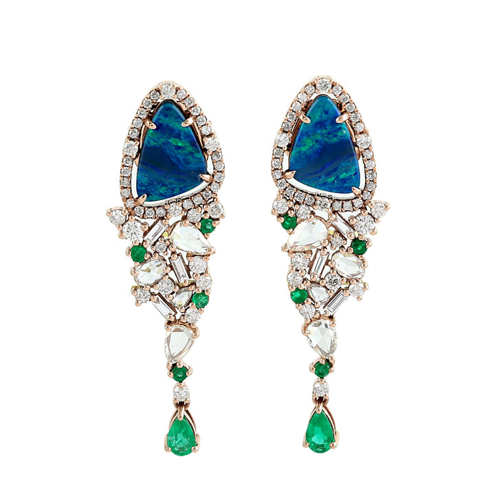 These Opal Doublet & Emerald Baguette Diamond Dangle Earrings in Rose Gold by Artisan balance luminous color with refined luxury. Iridescent opal doublets pair with striking emerald baguettes, framed by a halo of diamonds that catch every angle of light. Modern yet timeless, this handcrafted design celebrates premium gemstones in a radiant statement of artistry and elegance.