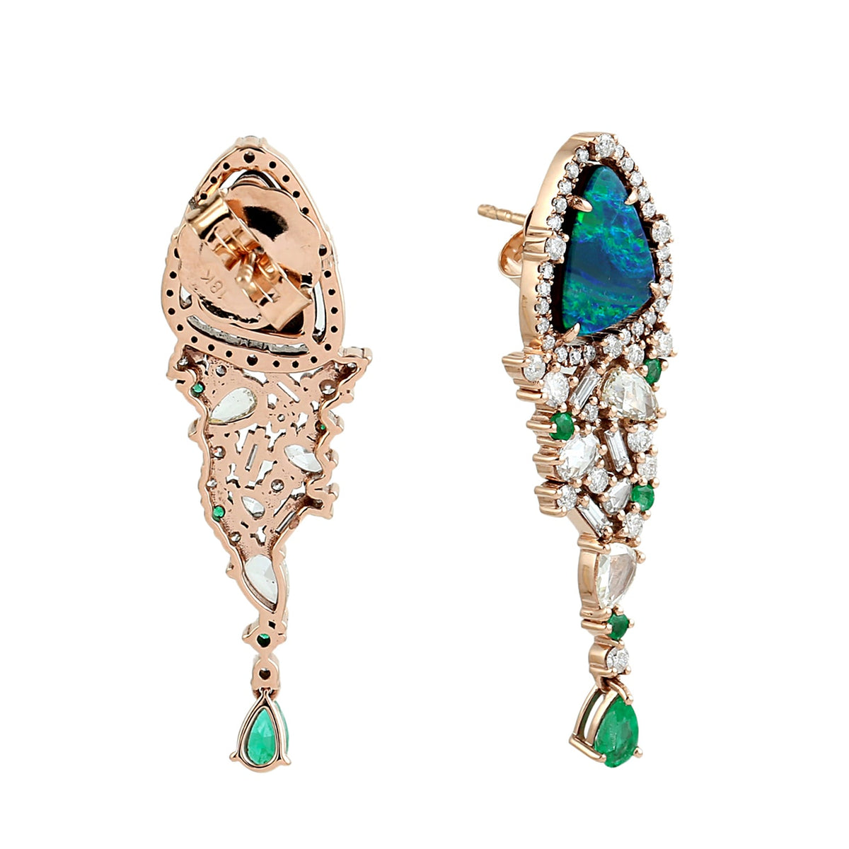Handmade in 18k rose gold. Set with 1.92 ct diamonds, 3.33 ct opal doublets, and 0.64 ct emeralds. Made in India.