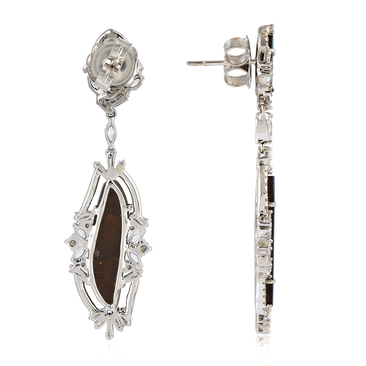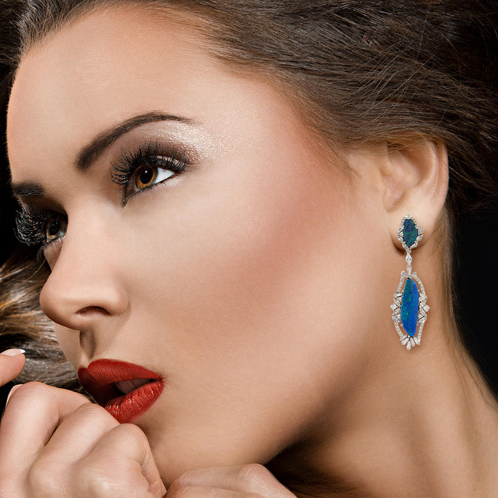 Opal Doublet & Sapphire Baguette Diamond Dangle Earrings In White Gold