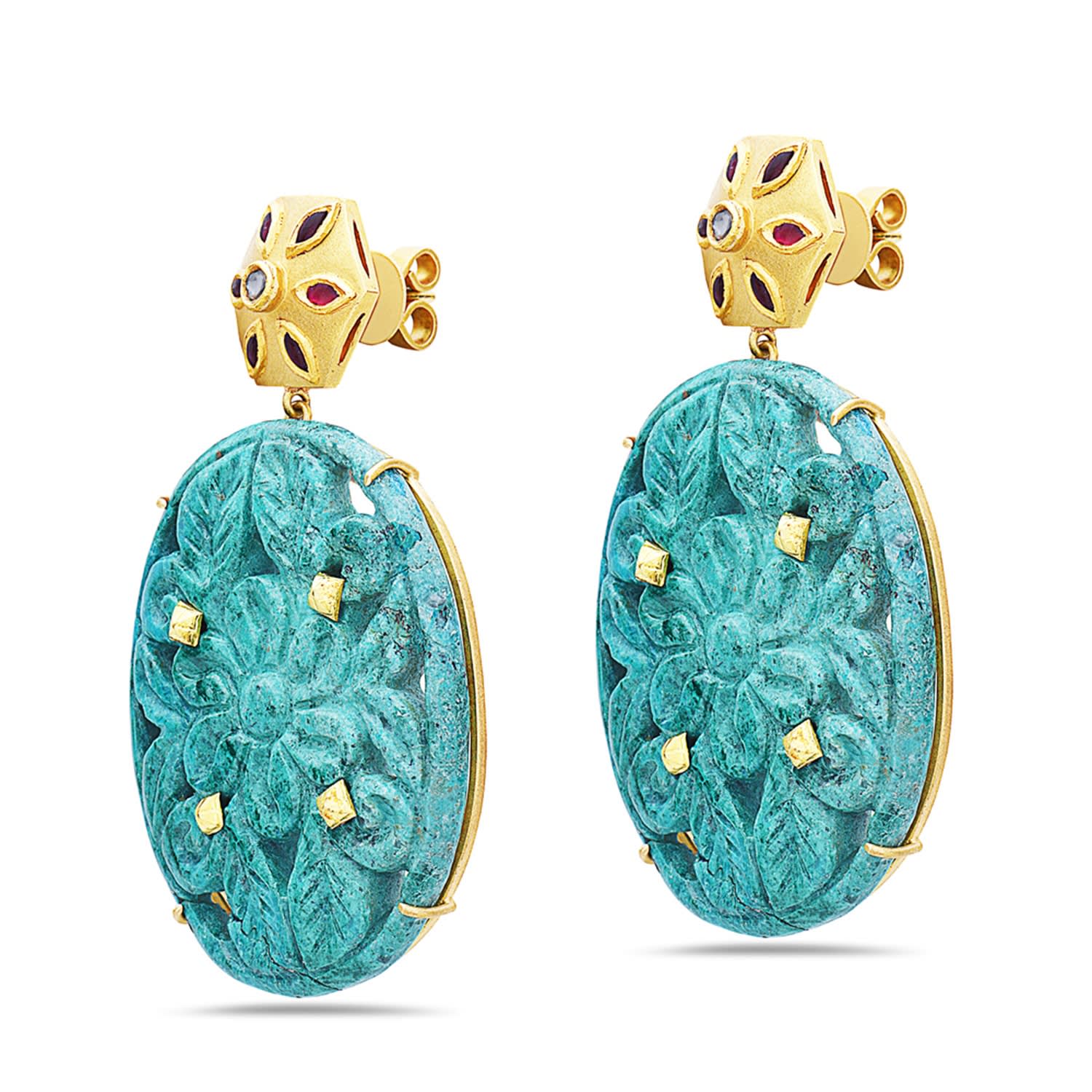 Handmade in 18k yellow gold. Set with 0.16 ct diamonds, 114.52 ct carved turquoise, and 1.2 ct rubies. Dangle style. Made in India.