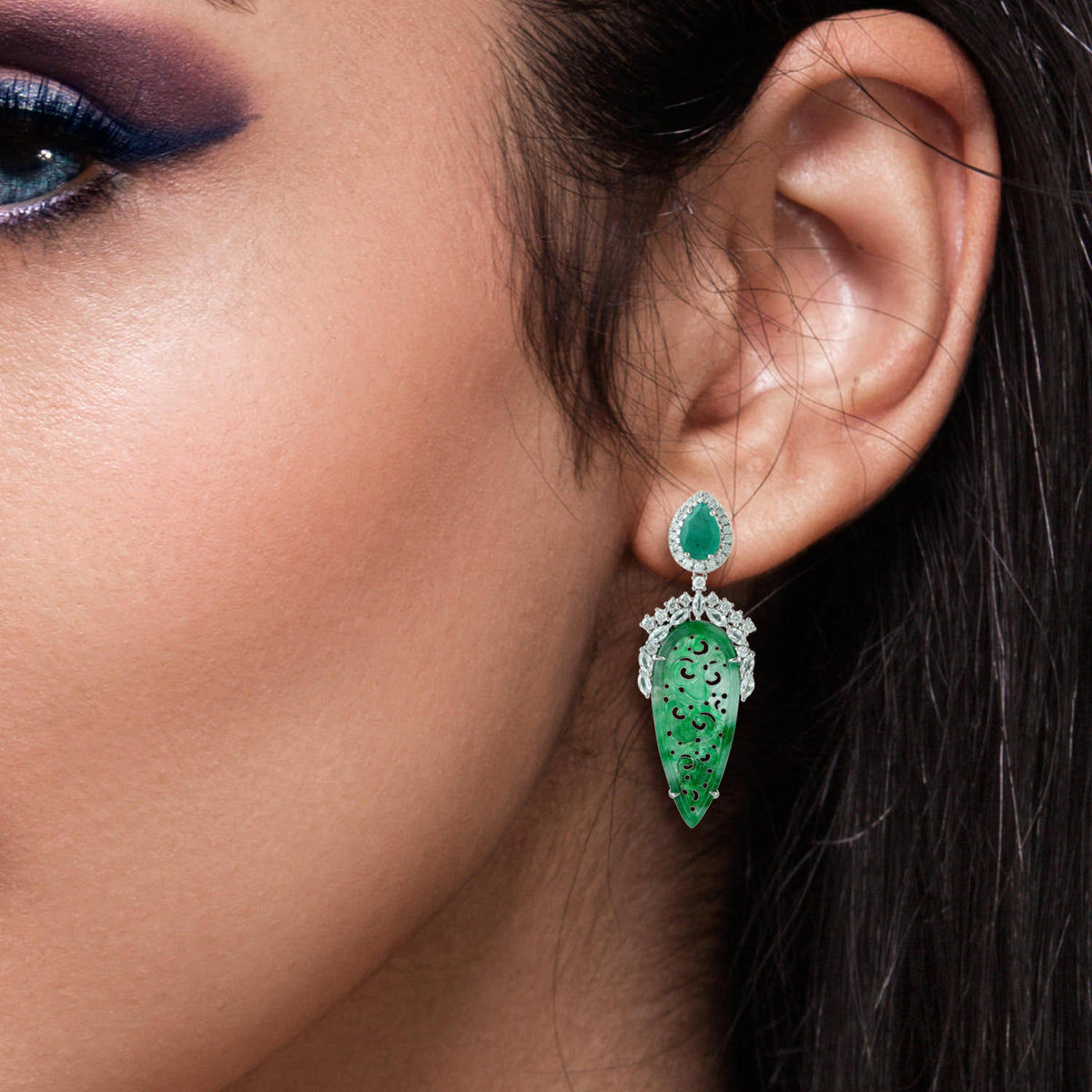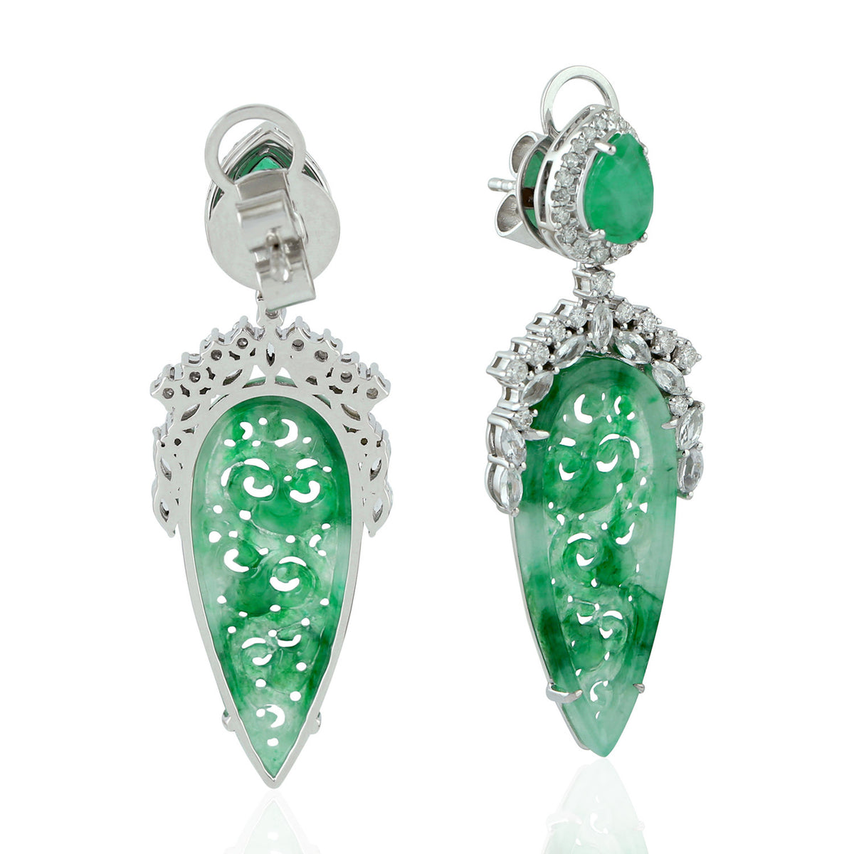 Carved Jade & Emerald Prong Sapphire Dangle Earrings In White Gold