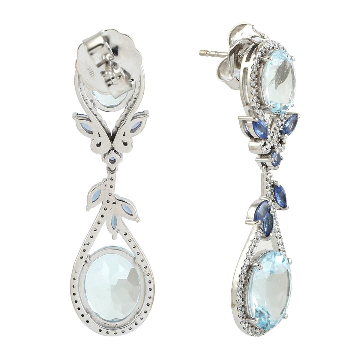 These handcrafted dangle earrings are made of 18k white gold. They feature 0.58ct of diamonds, 9.04ct of aquamarines, and 0.99ct of sapphires.
