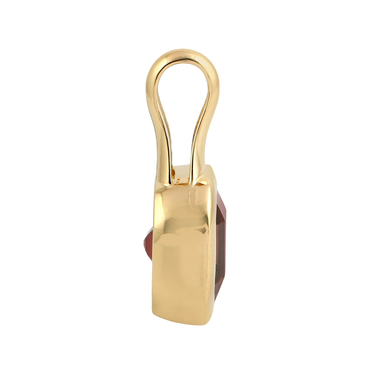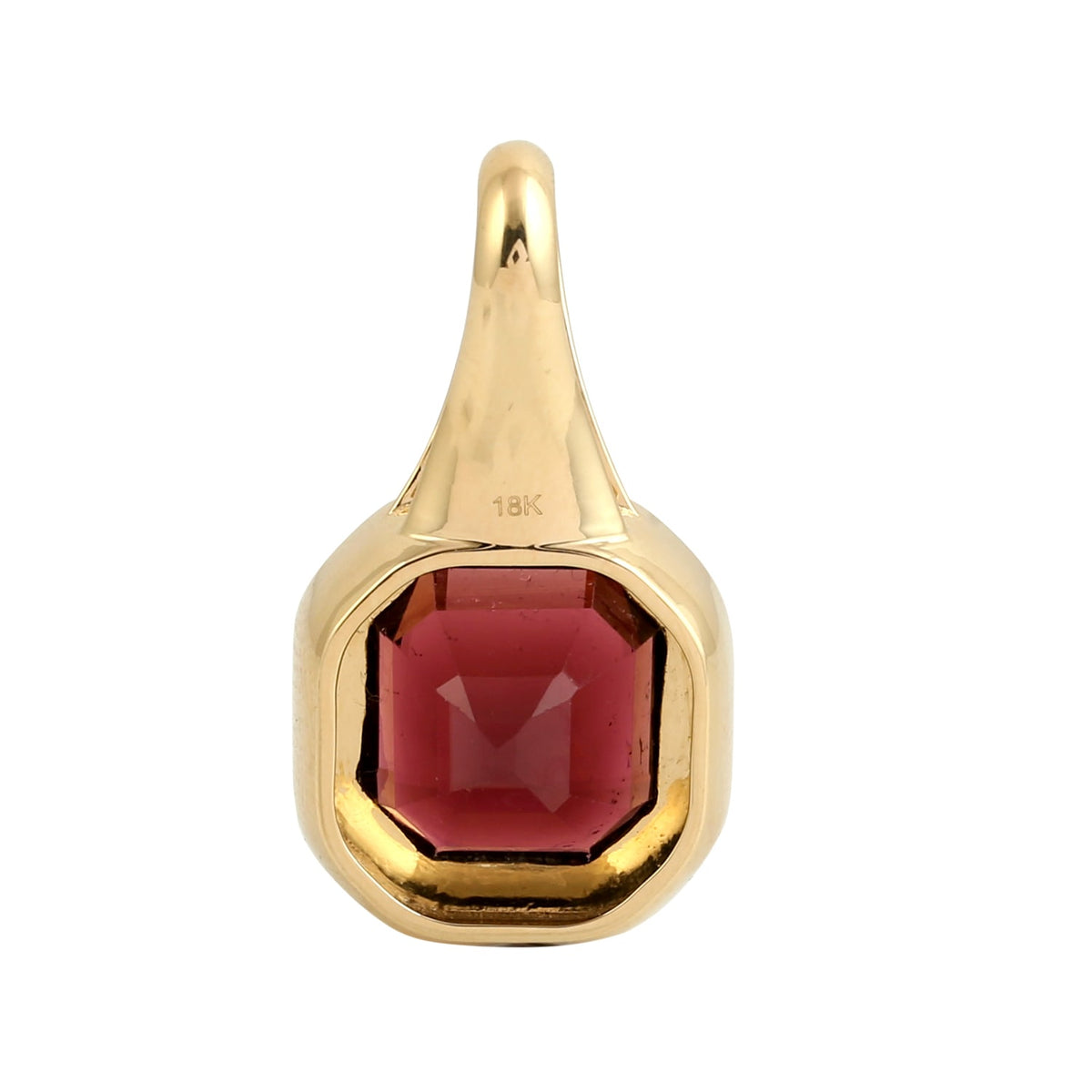 The 18K Yellow Gold Garnet Pendant by Artisan is a bold and minimal charm for modern elegance. This pendant is handmade from 18-karat yellow gold and is set with a large pink tourmaline stone. The simple yet striking design allows the natural glow of the gemstone to shine, making it a premium piece of jewelry perfect for adding a touch of bold elegance to your collection.