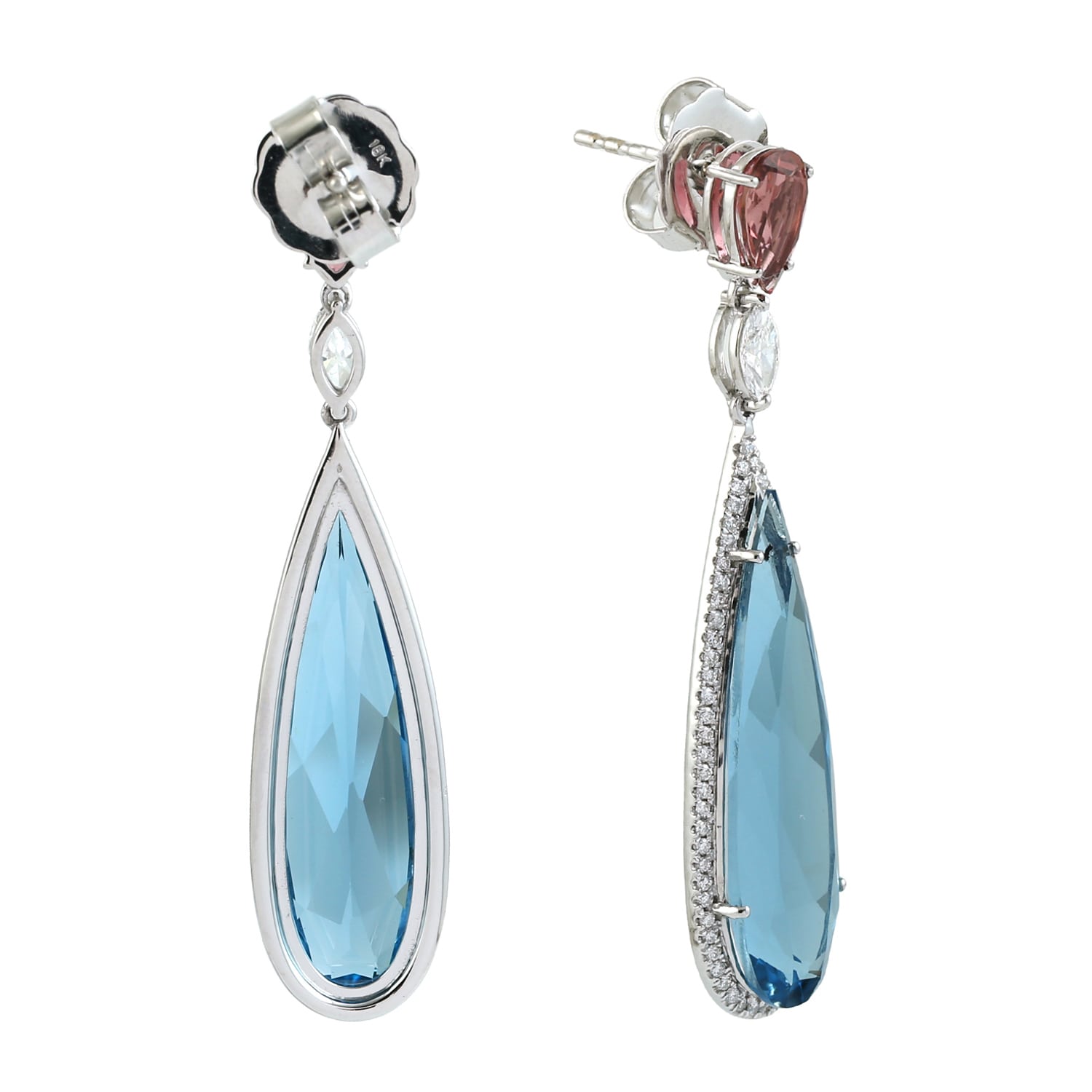 Blue Topaz Pear Pink Tourmaline Pave Diamond Dangle Earrings In White Gold