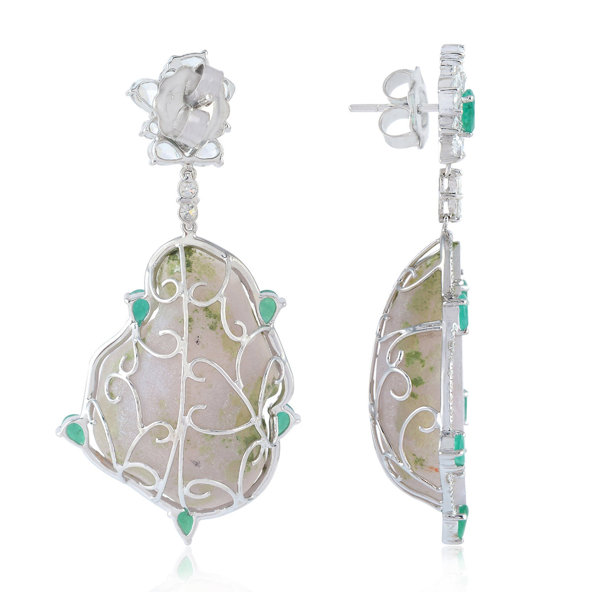 These handcrafted dangle earrings are made from 18-karat white gold. They are set with 57 carats of geode, 1.89 carats of emeralds, 2.48 carats of white sapphires, and 0.79 carats of diamonds. They are handmade in India.