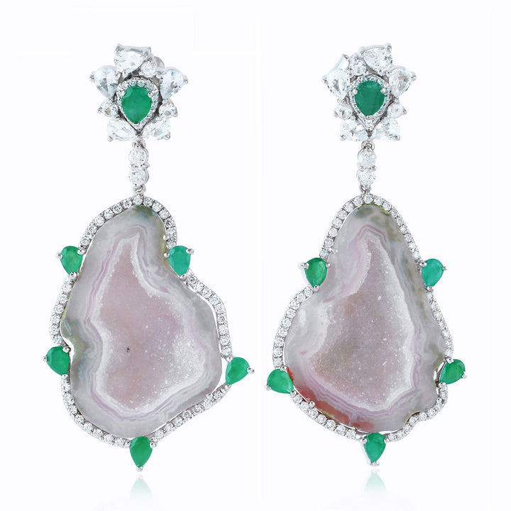 Geode, Emerald & White Sapphire Dangle Earrings With Pave Diamonds In White Gold