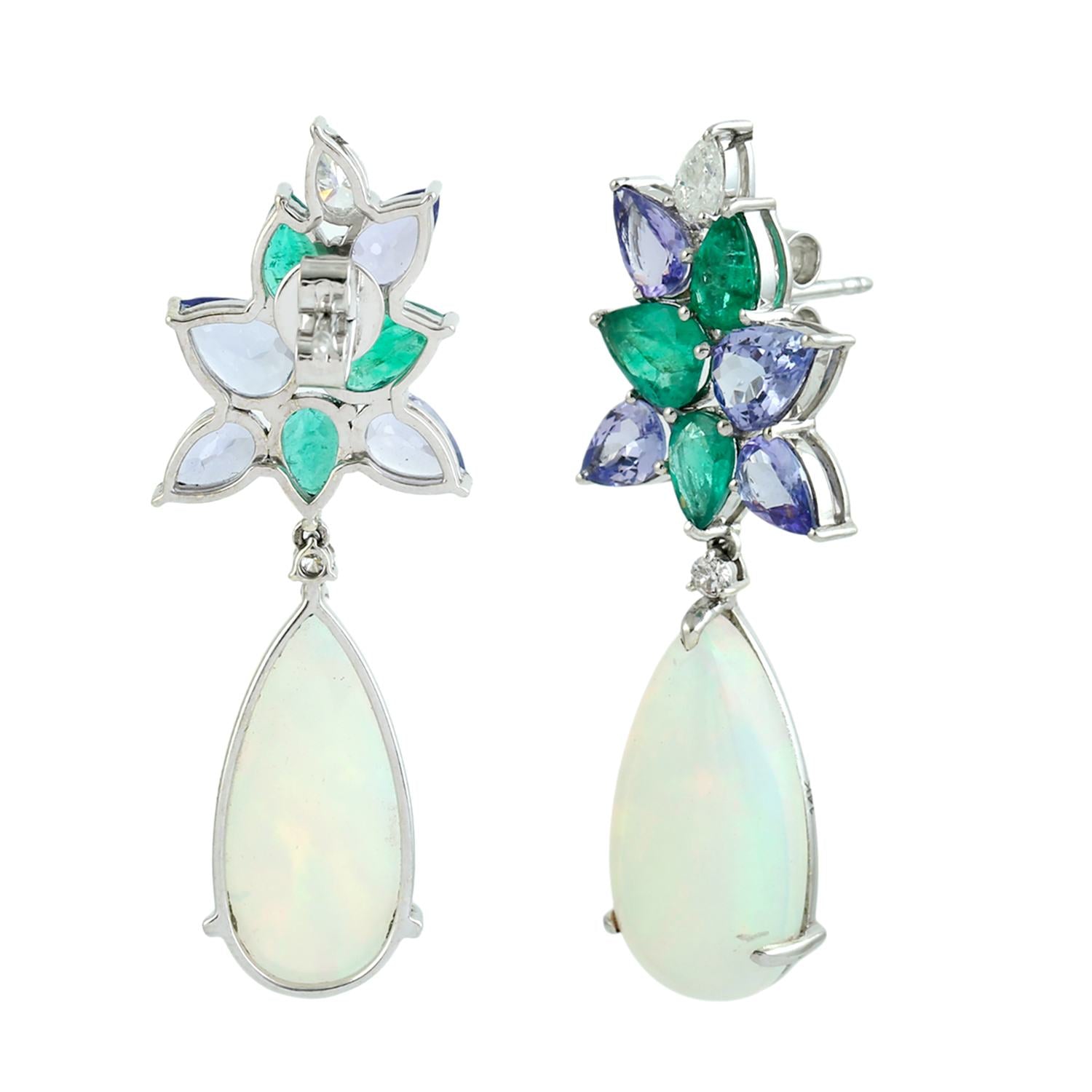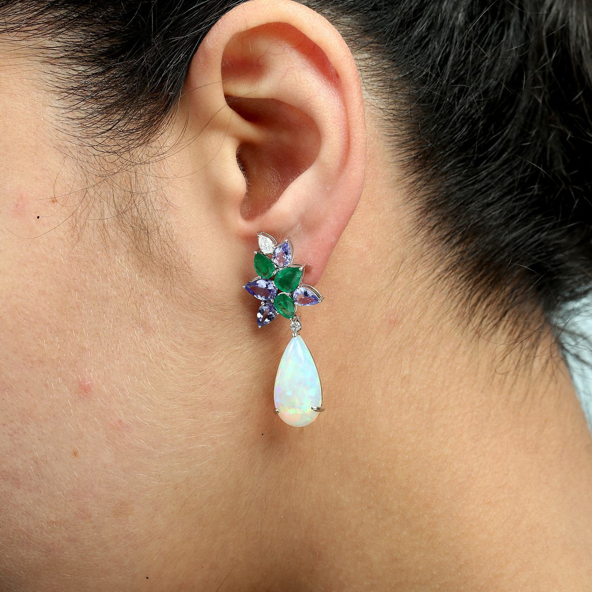 These dangle earrings are handmade from 14-karat white gold. They are set with 0.4 carats of diamonds, 11.54 carats of Ethiopian opal, 3.12 carats of tanzanite, and emerald. They are handmade in India.