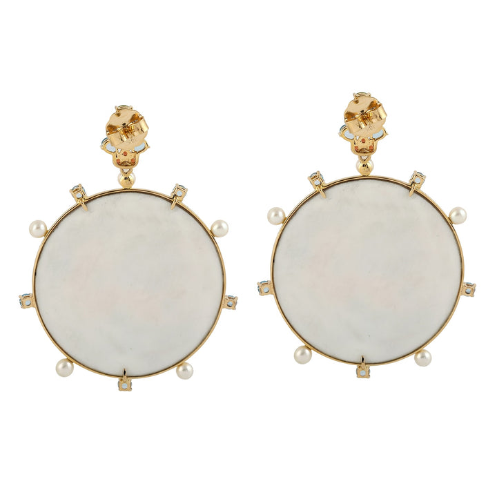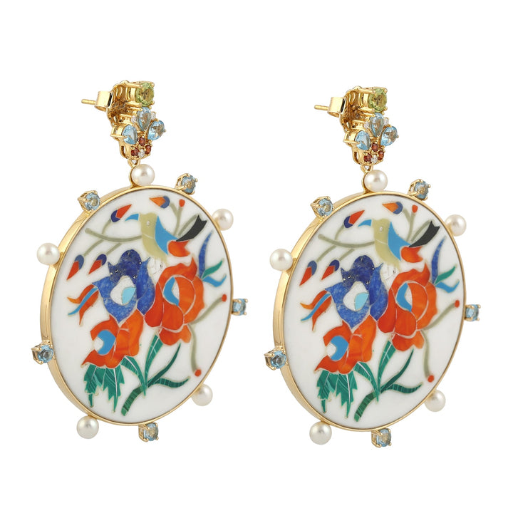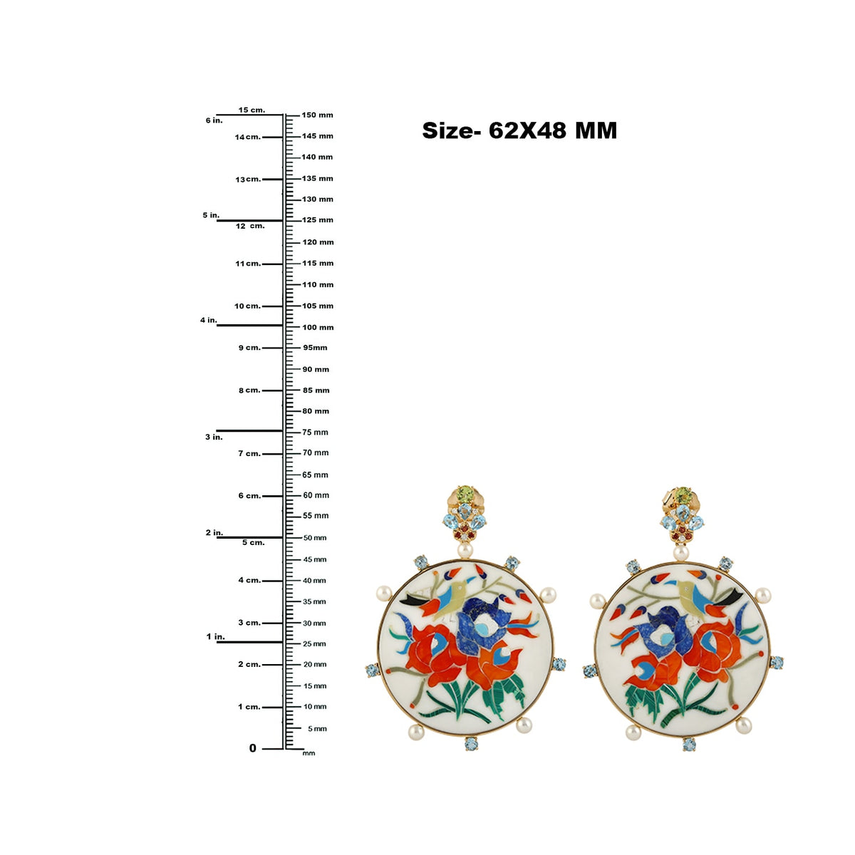 These dangle earrings are handmade from 18-karat yellow gold. They are set with 0.13 carats of diamonds, 56.1 carats of bakelite, 4.14 carats of pearls, and 0.65 carats of blue topaz. The product description also mentions Peridot.