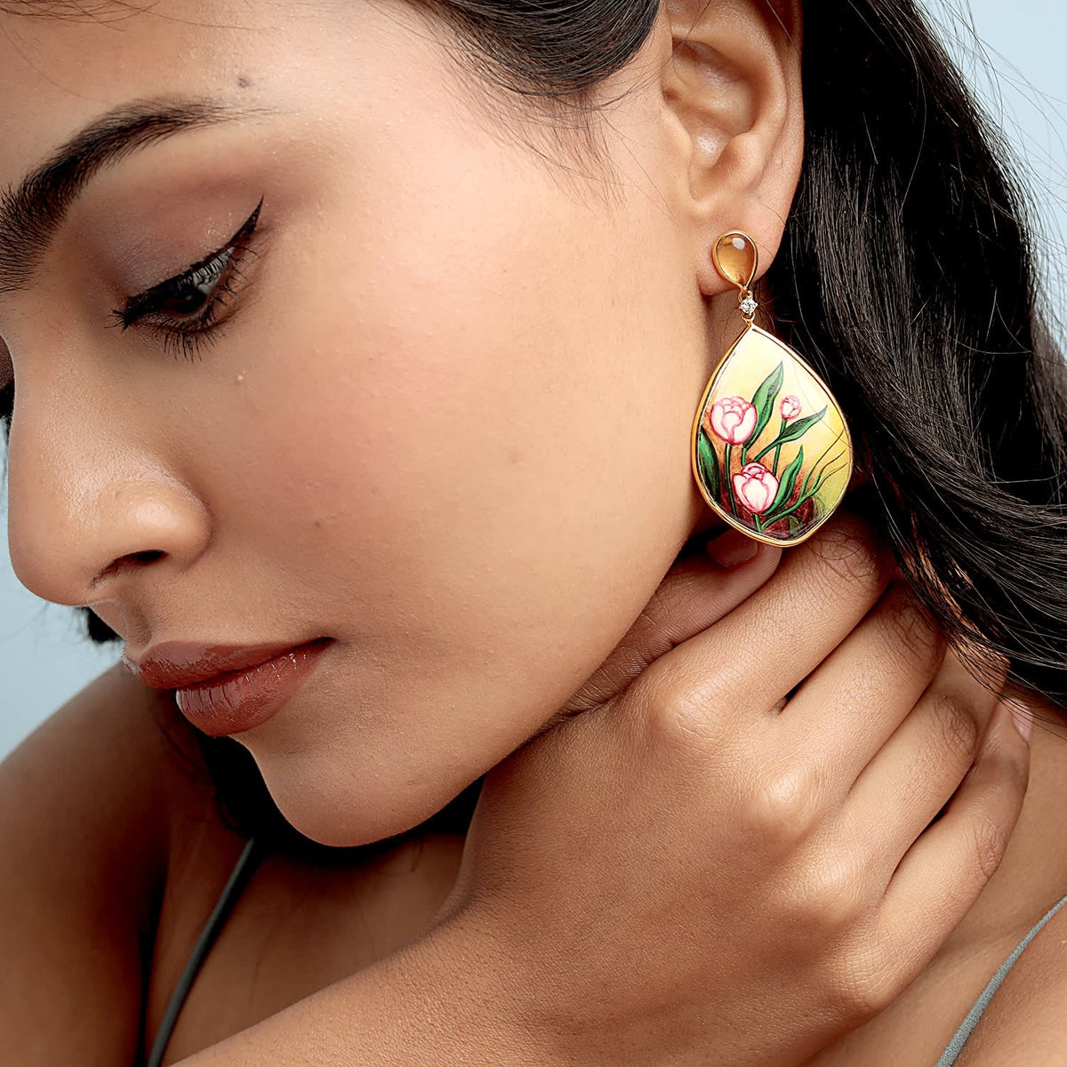 The Onyx & Citrine Prong Diamond Picture Enamel Dangle Earrings In Gold by Artisan are a unique and artistic pair of earrings. These handmade earrings are crafted from 18-karat yellow gold and feature a combination of onyx, citrine, and enamel. The pieces are accented with diamonds in a prong setting, and the unique design creates a natural glow.