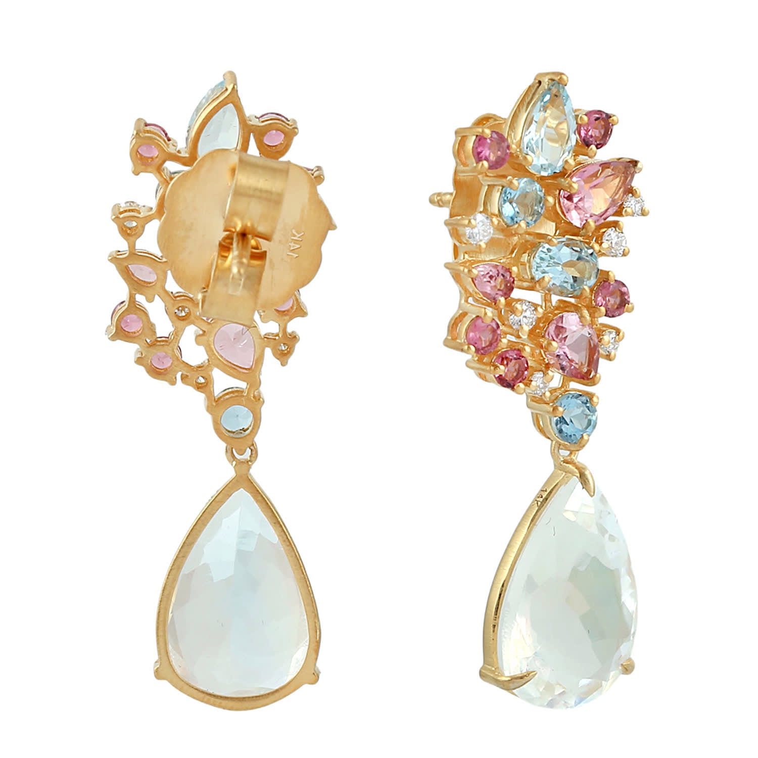 Pink Tourmaline & Blue Moonstone Aquamarine Pave Diamond Dangle Earrings In Gold