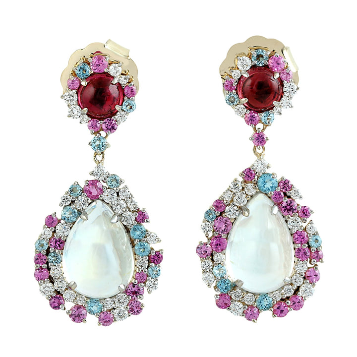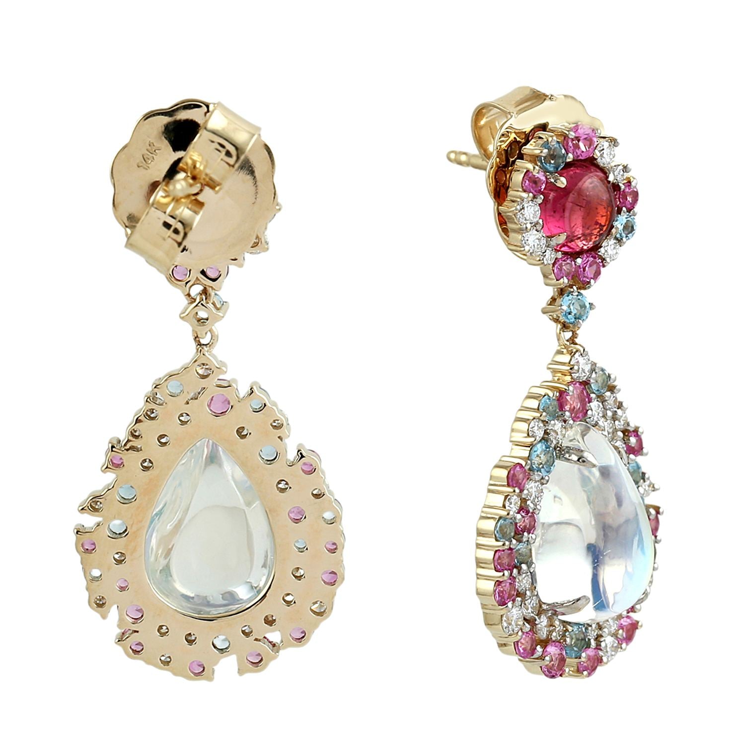 This earring is handmade from 14k Yellow Gold and is set with a variety of gemstones, including Moonstone Blue (6.97 cts), Pink Sapphire (1.11 cts), Pink Tourmaline (0.63 cts), and Blue Topaz (0.63 cts), as well as Diamonds (0.64 cts).