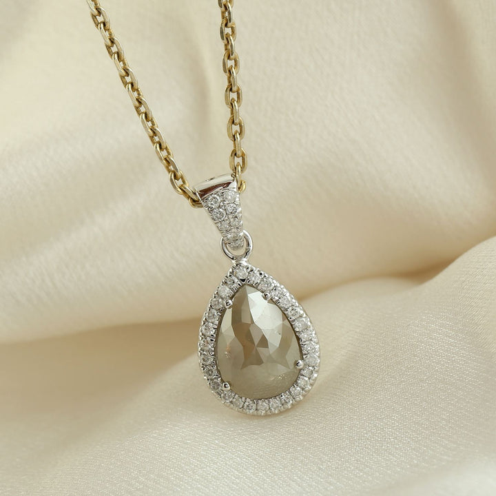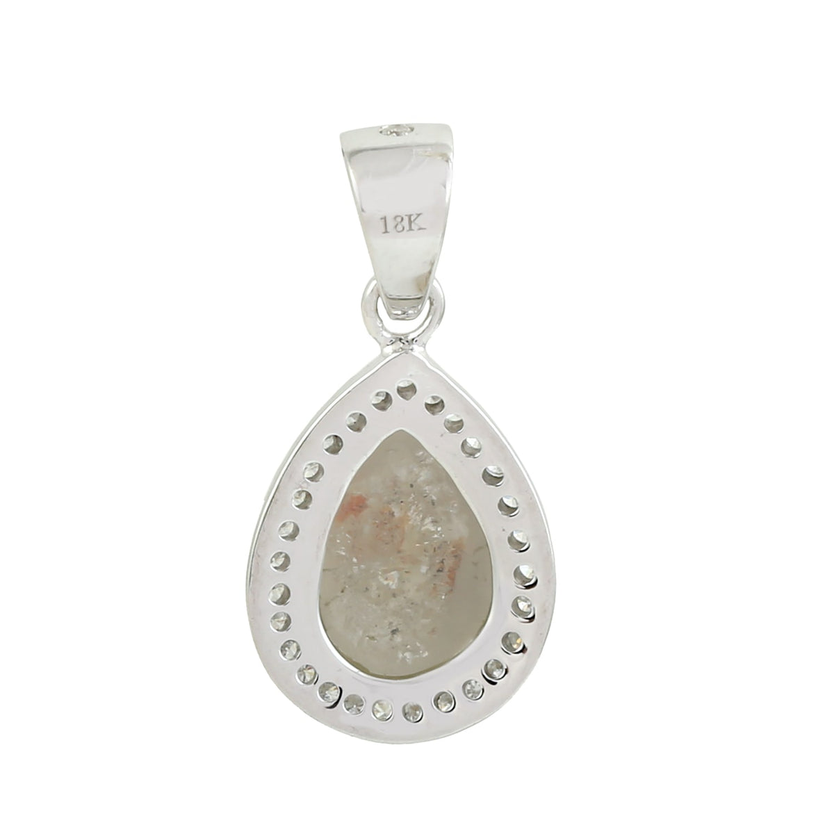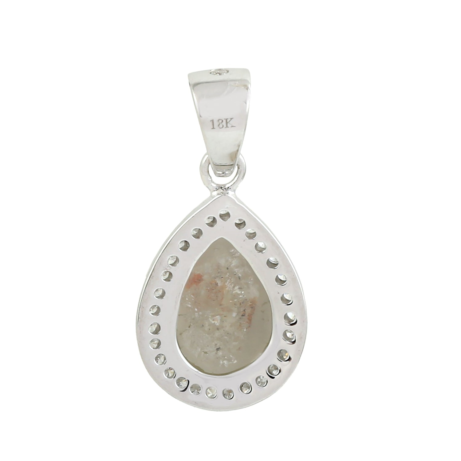 This pendant is crafted from 18K white gold and features a 3.02-carat pear-shaped rose-cut center diamond with a halo of brilliant round diamonds and a diamond-accented bail. The chain is not included.