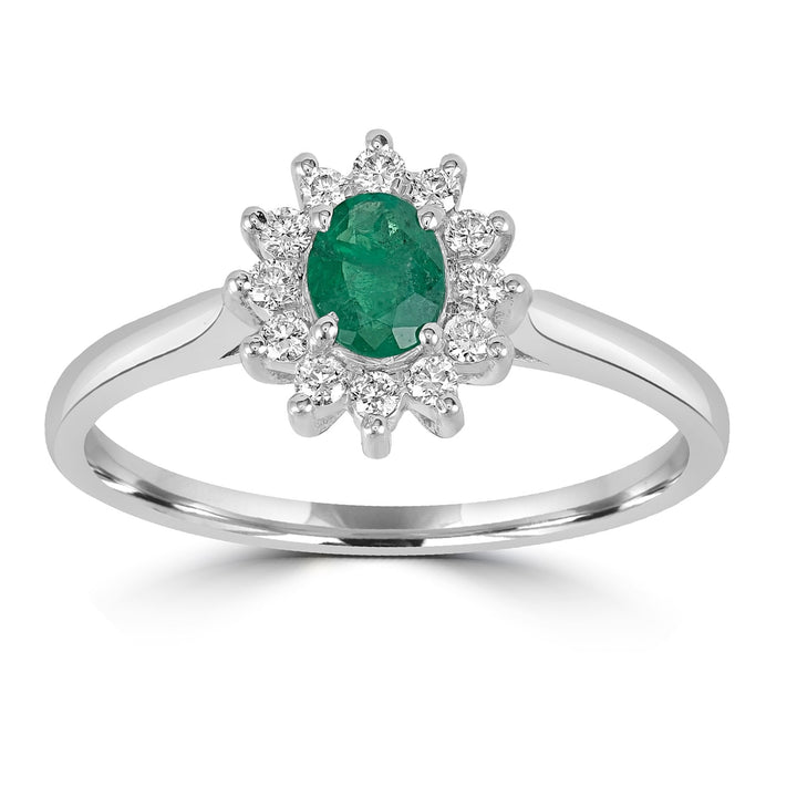 This handcrafted ring is made from 18k white gold. It features an oval-cut natural emerald (0.33 ctw) and brilliant-cut halo diamonds (0.16 ctw). This ring is a US size 7.