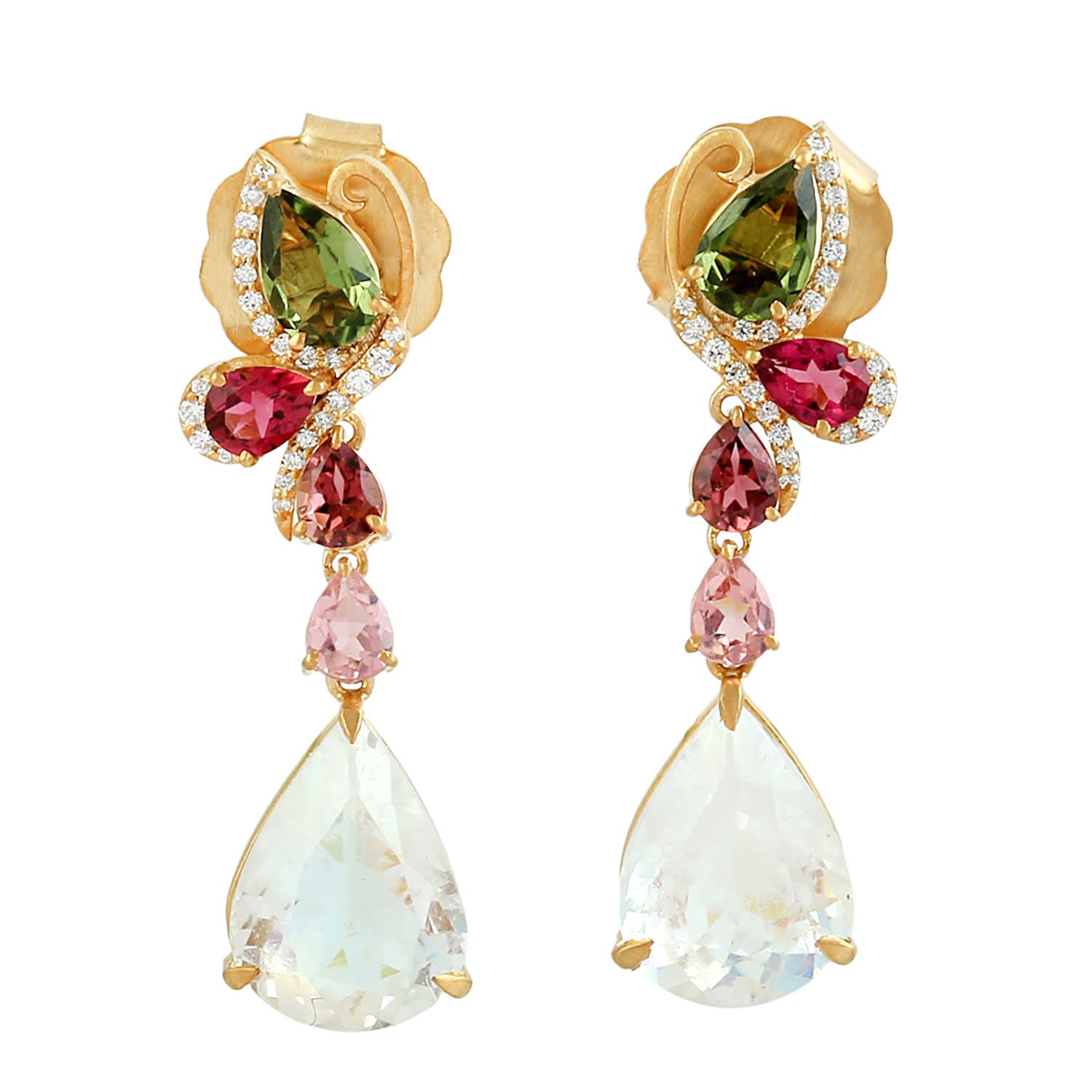 These dangle earrings are handcrafted from 14K yellow gold. They are set with green, pink & red tourmalines, a white quartz drop, and pavé diamonds (0.13cts). They also have blue moonstones (6.02cts).