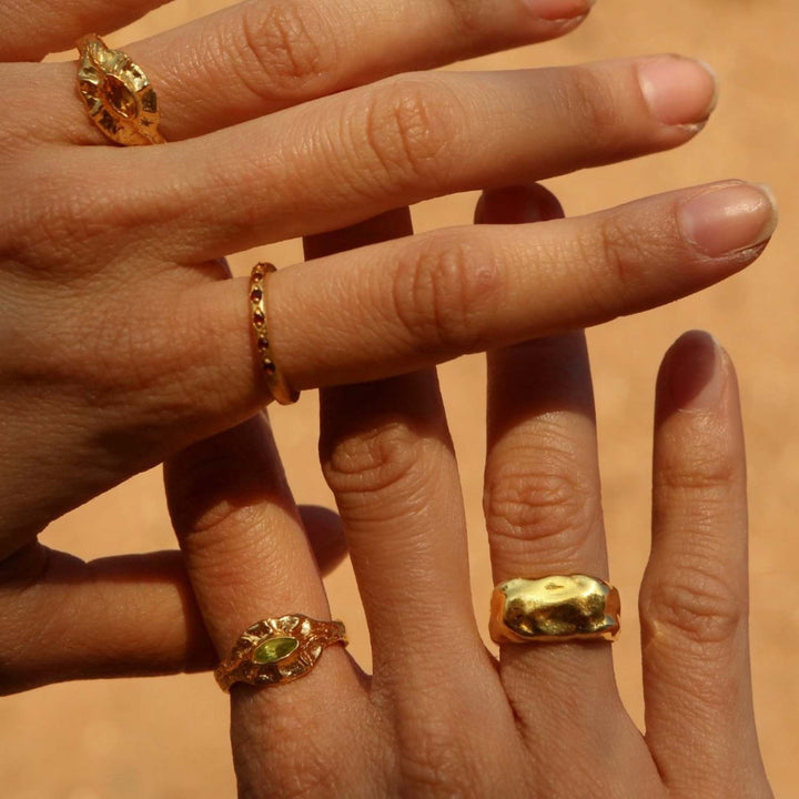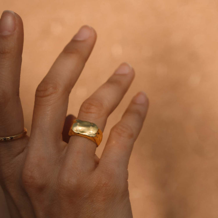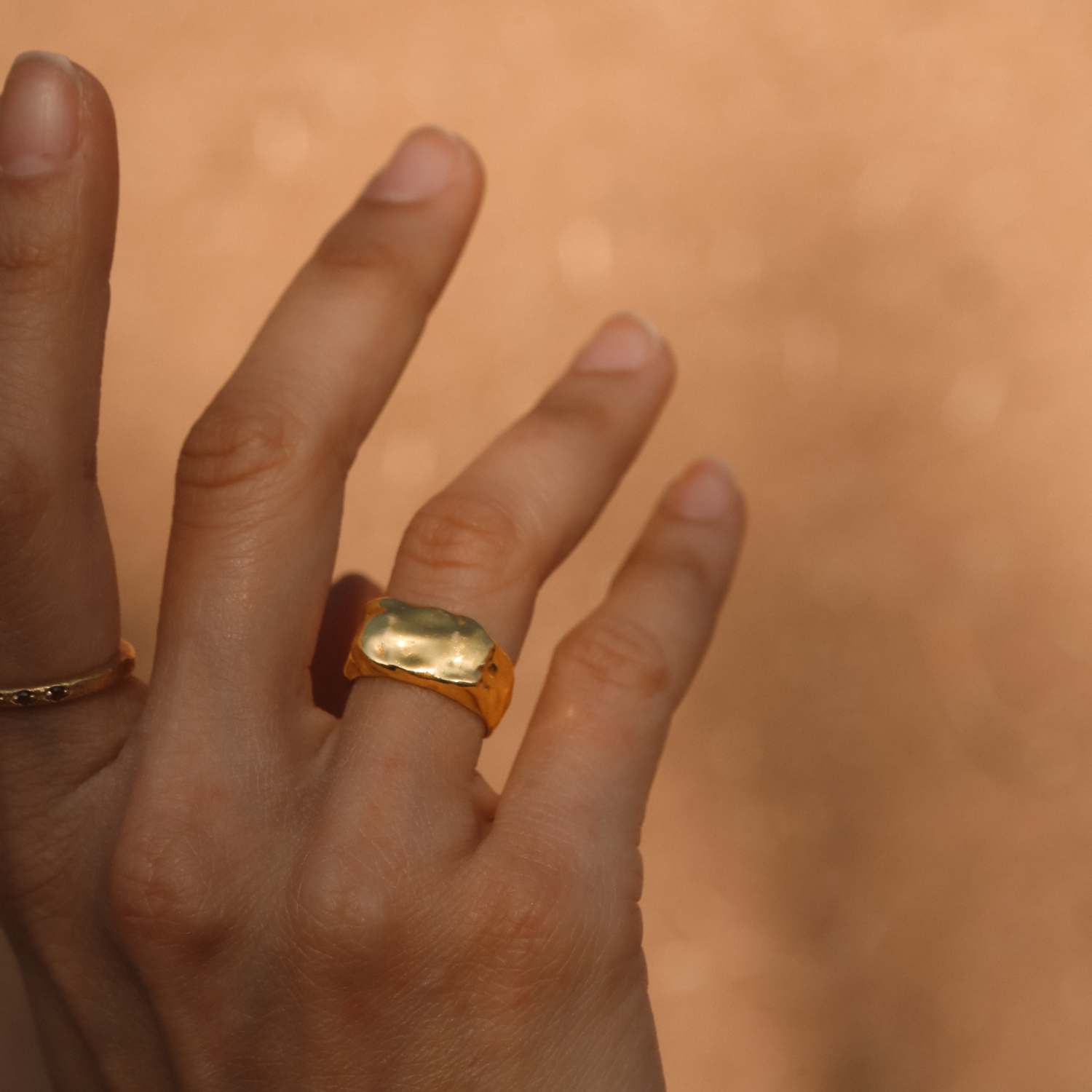 This Echo Chunky Gold Ring by Assuwa is inspired by the myth of the mountain nymph Echo, symbolizing the power to express love and emotion. This chunky gold ring has a modern, artistic aesthetic inspired by sound waves, making it a powerful and meaningful accessory. It’s perfect for adding a bold statement to your look and is designed to be a new favorite for stacking with other rings for a unique and personalized style.