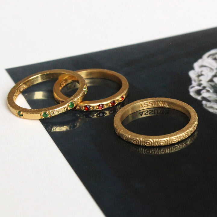 This Cleopatra & Mehen Ring Set by Assuwa is a captivating duo that channels the mystique of Ancient Egypt. The Cleopatra Ring, adorned with a mesmerizing tsavorite gemstone, pairs perfectly with the playful Mehen Ring, inviting you to embrace the allure of history as wearable art. Each set is a unique, handcrafted piece, with variations in the hand-picked gemstones adding to their one-of-a-kind nature.
