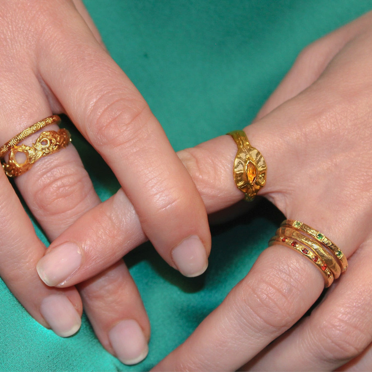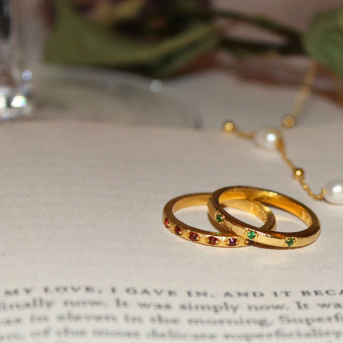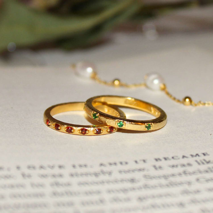 This Lovers Ring With Garnet And Tsavourite by Assuwa is a delicate and meaningful ring set dedicated to the world's greatest lovers, Cleopatra and Antonius. It is designed to inspire you to embrace love's transformative potential. The ring features a harmonious blend of garnet, symbolizing strength and passion, and tsavorite, representing courage and assertiveness. This unique and handcrafted piece is a perfect gift for a wedding, anniversary, or birthday.