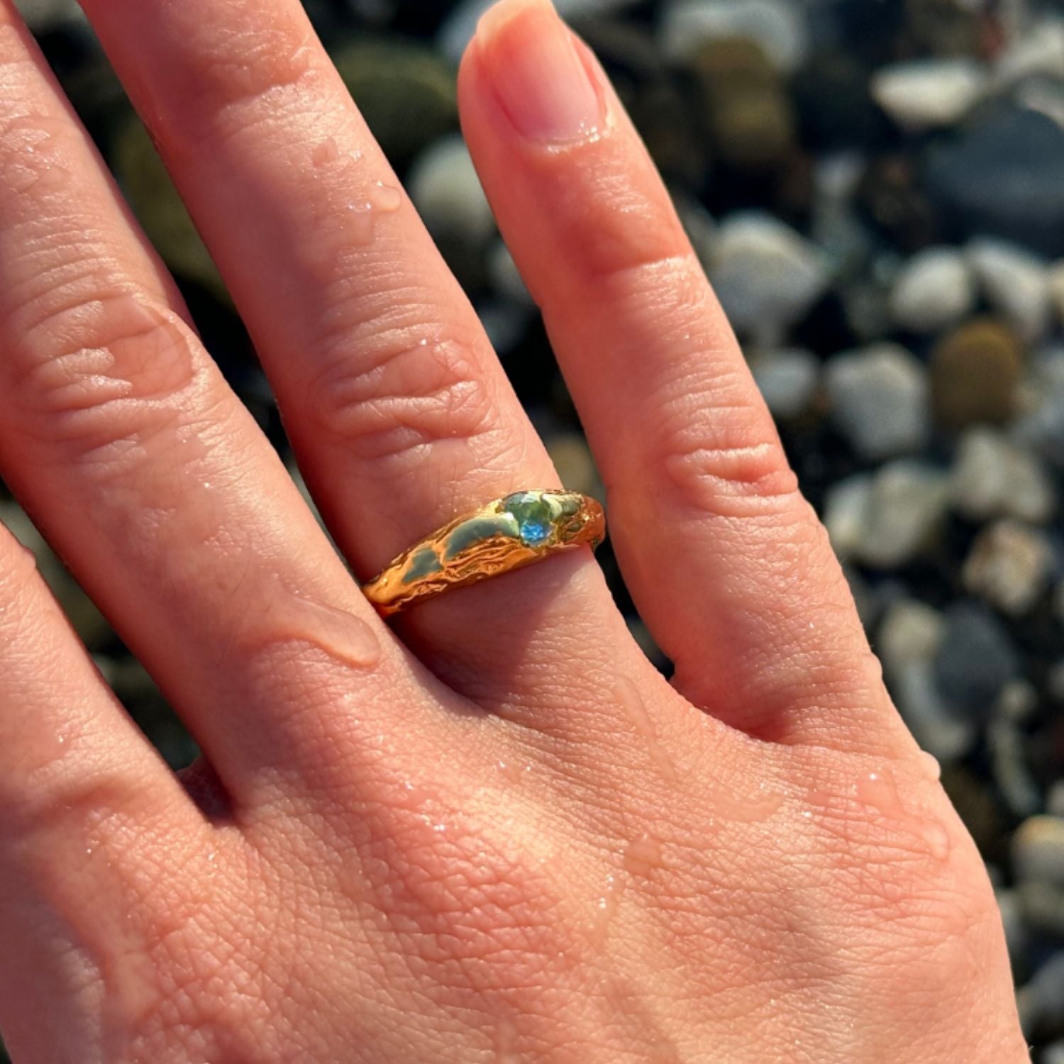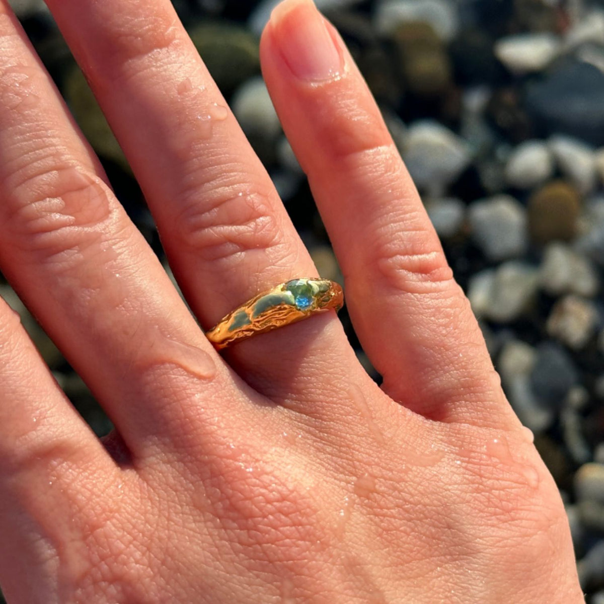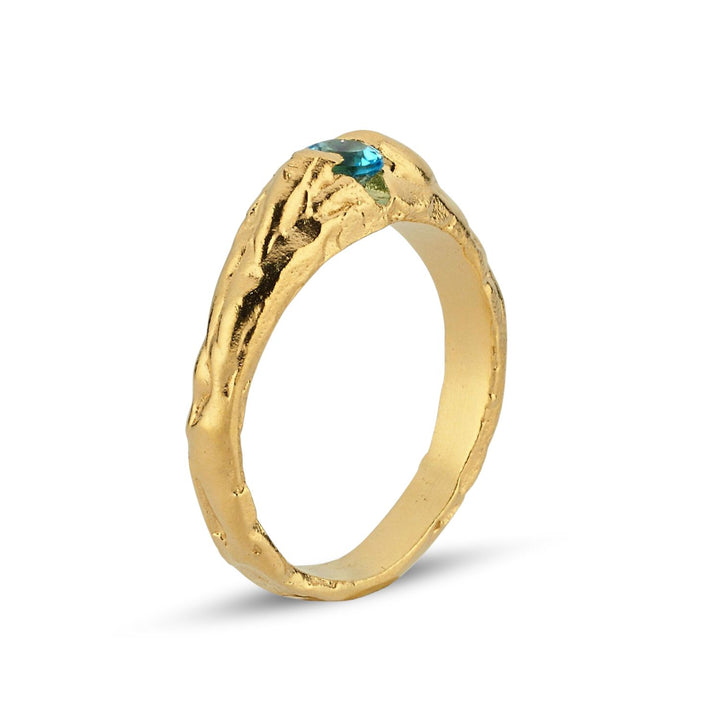 The Amphitrite Blue Topaz Ring by Assuwa is a beautiful tribute to the Greek goddess of the sea. Handcrafted using the ancient lost wax casting method, this ring features a stunning blue topaz gemstone set in 18-karat gold micron plated 925 sterling silver. The blue topaz, a symbol of calmness and honesty, is believed to bring emotional balance, making this a meaningful accessory.