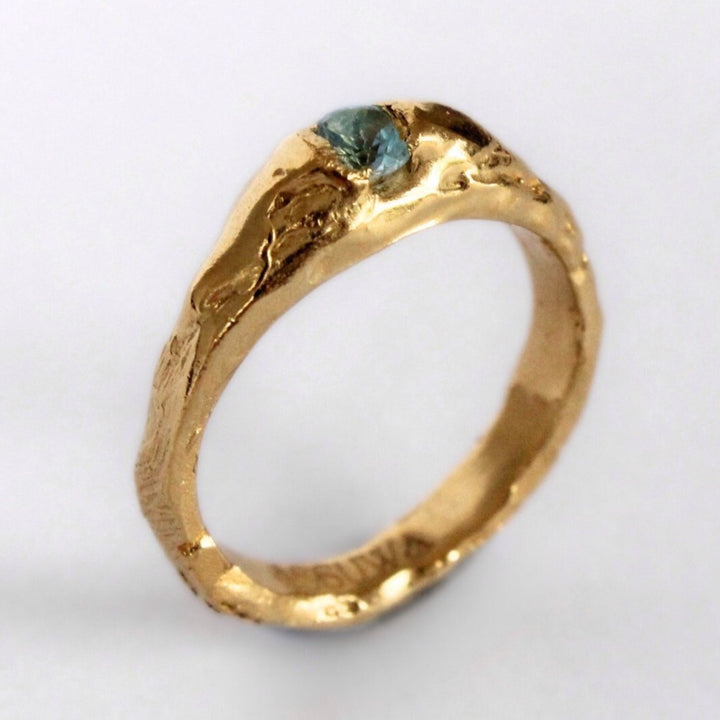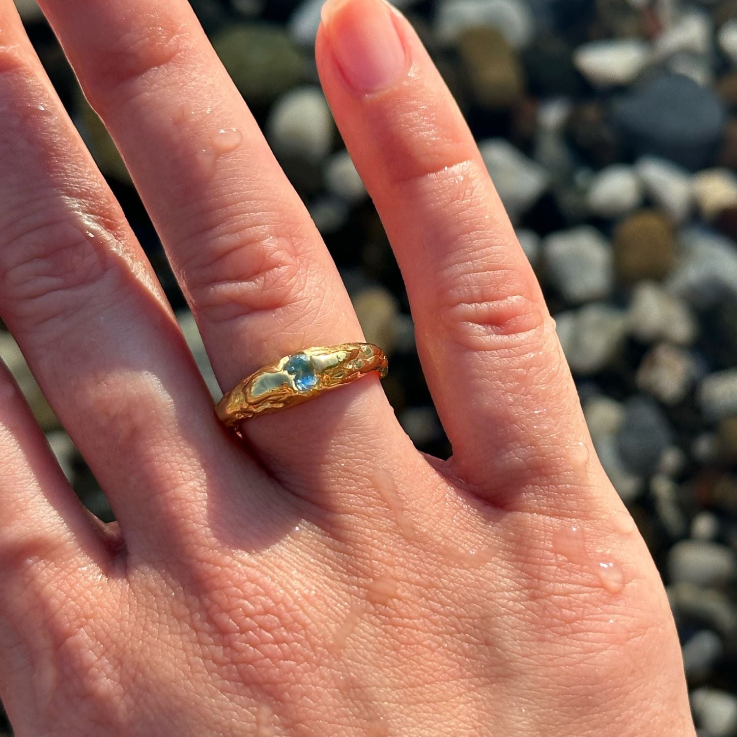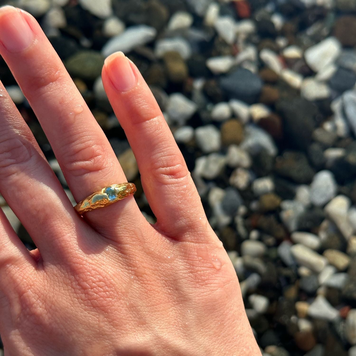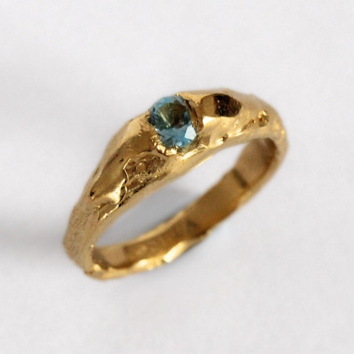 The Amphitrite Blue Topaz Ring by Assuwa is a beautiful tribute to the Greek goddess of the sea. Handcrafted using the ancient lost wax casting method, this ring features a stunning blue topaz gemstone set in 18-karat gold micron plated 925 sterling silver. The blue topaz, a symbol of calmness and honesty, is believed to bring emotional balance, making this a meaningful accessory.