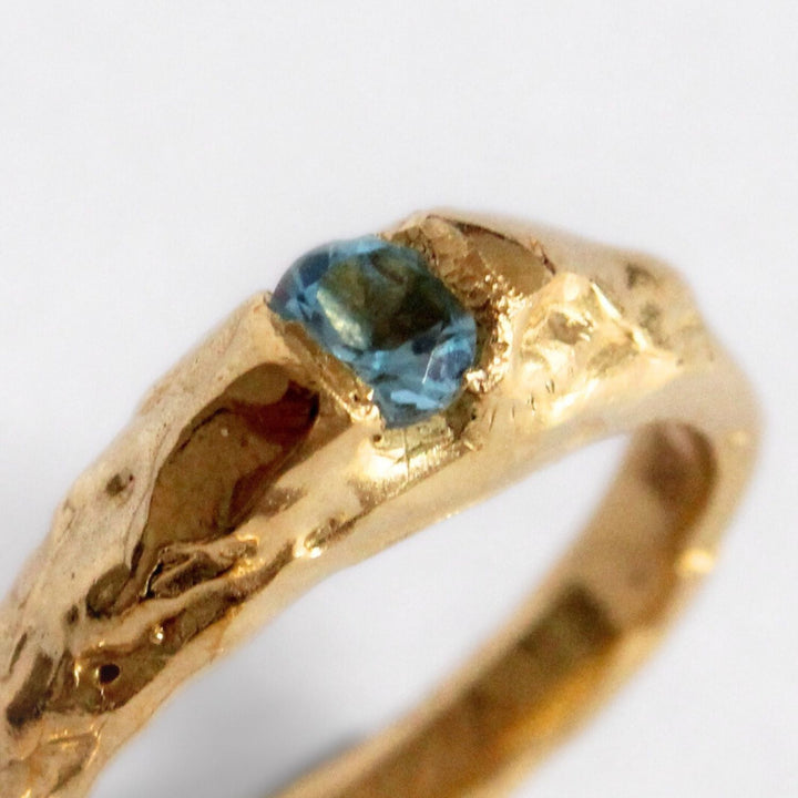This ring is handcrafted from 925 sterling silver with 18-karat gold micron plating. It is set with a blue topaz gemstone and weighs 4.5g.