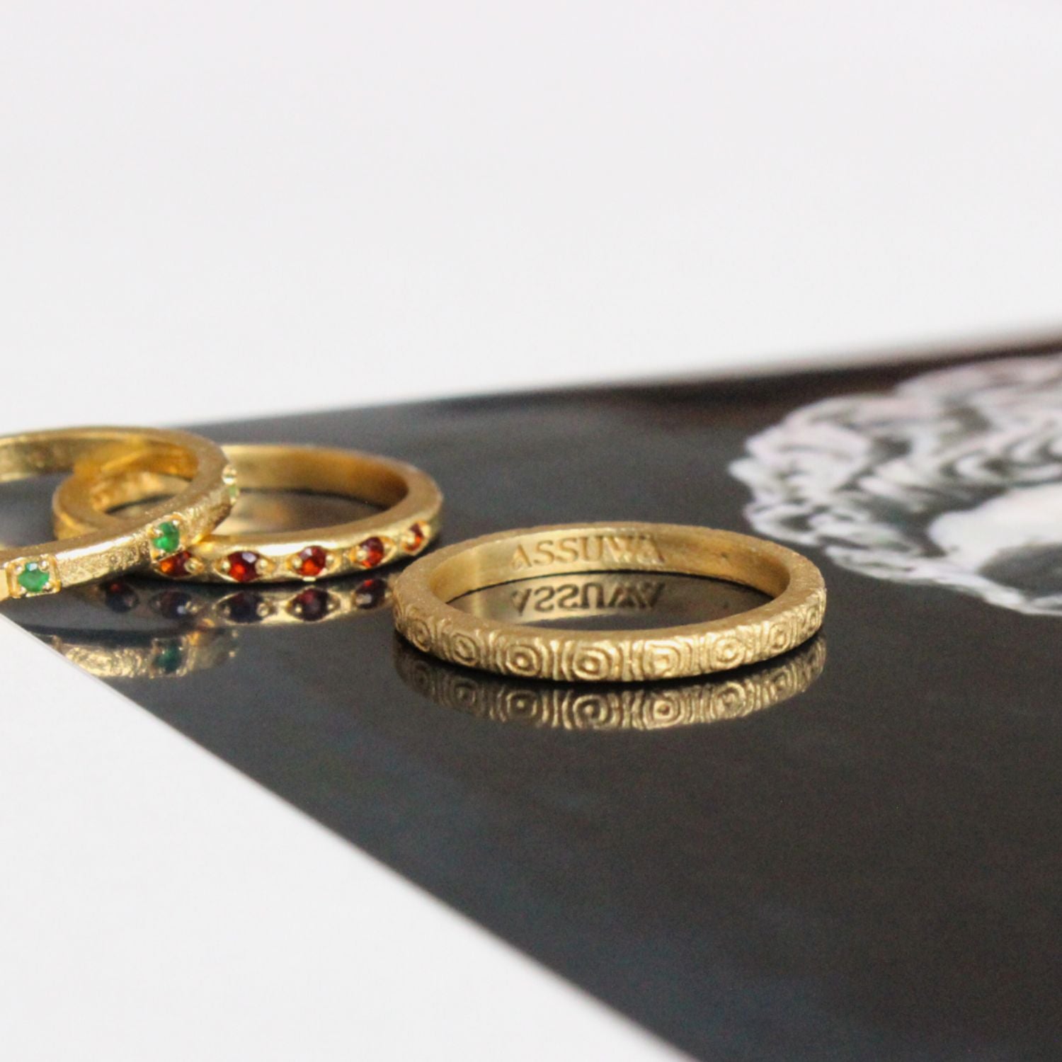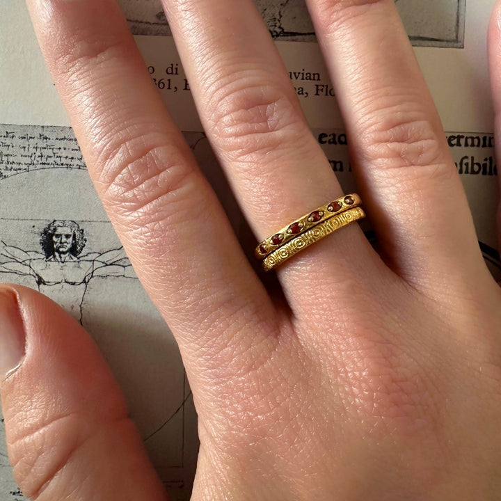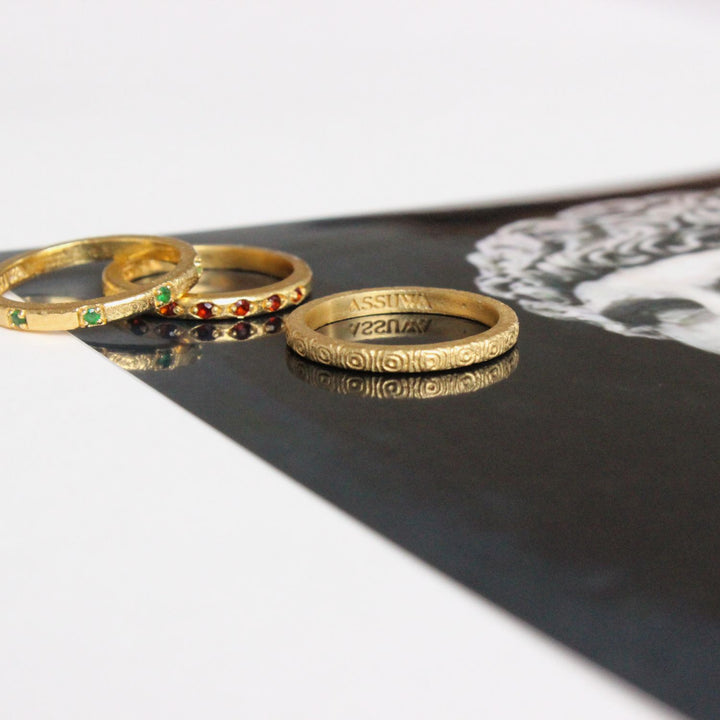 The Antonius & Mehen Ring Set by Assuwa is a handcrafted set with an ancient story. The Antonius Ring, honoring Marcus Antonius, is adorned with a vibrant red garnet, symbolizing the strength and commitment of his legendary love. It is paired with the Mehen Ring, inspired by the playful games of Cleopatra and Antonius, encouraging love and joy.