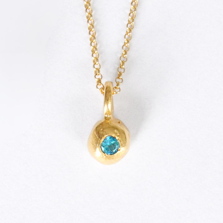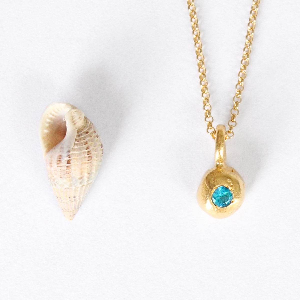 This handcrafted necklace is made from 925 sterling silver with 18kt high-quality gold micron plating. It features a natural aquamarine gemstone. The piece is made using the lost-wax casting technique.