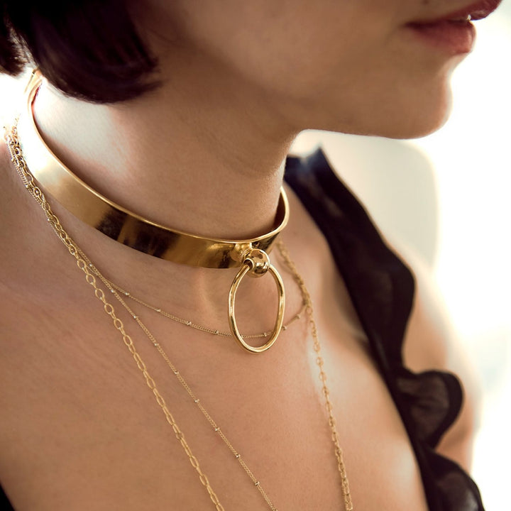 The Collar Discreet Collar Necklace by Atelier Petites Pierres is a bold yet minimalist statement piece. Crafted from high-quality gold-filled brass with a sleek O-ring detail, its clean and contemporary design is versatile and can be worn alone or layered. The necklace is adjustable, offering a tailored and comfortable fit.