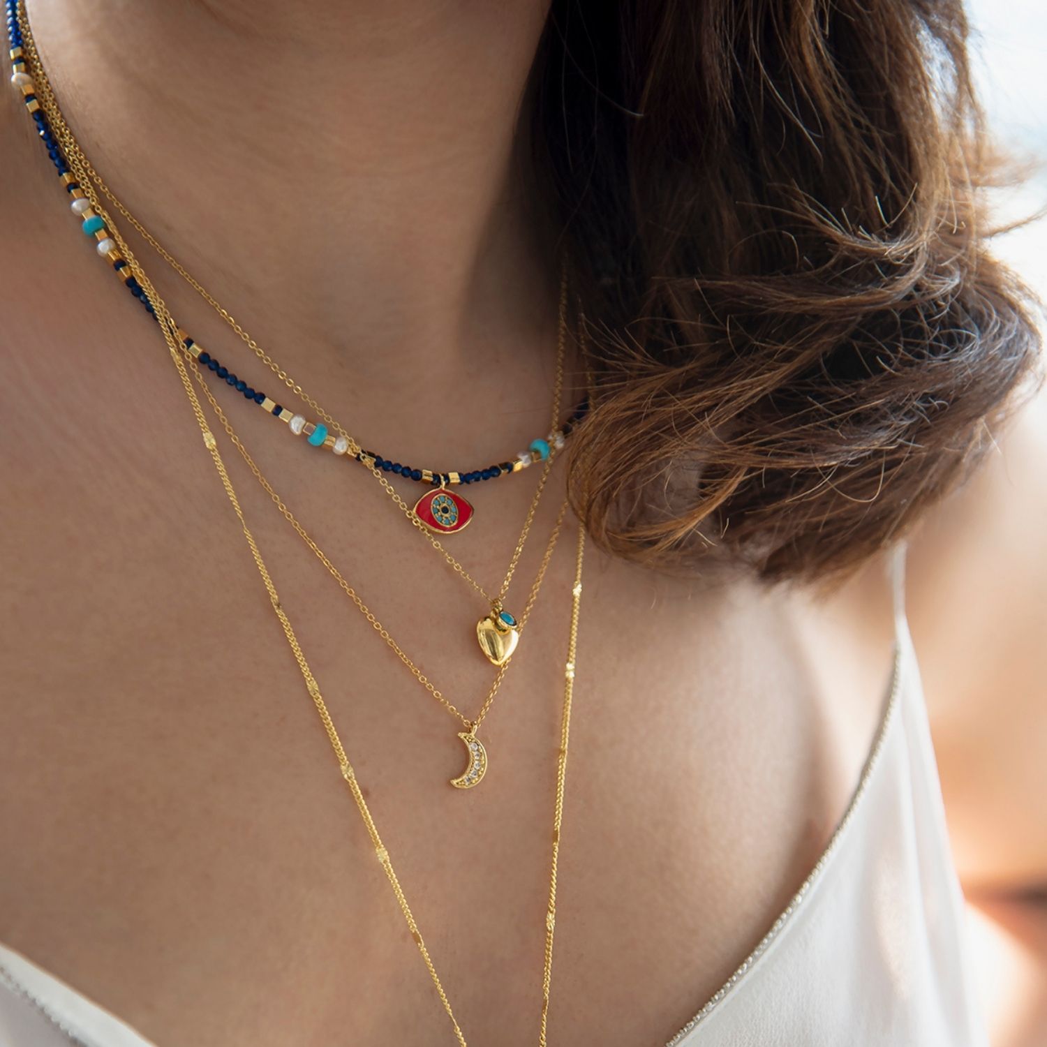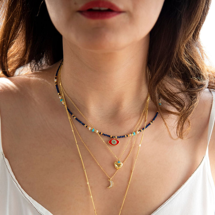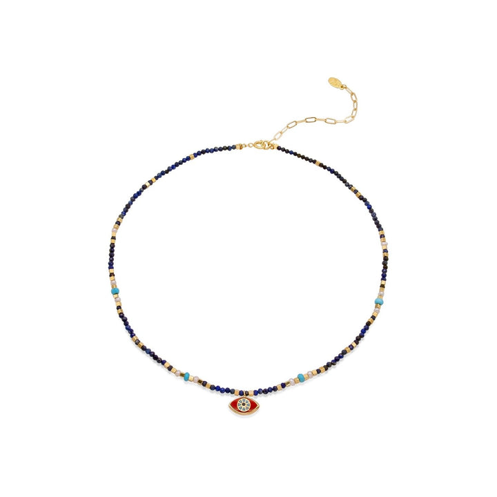 The Tiny Mini - Natural Beaded Necklace by Atelier Petites Pierres is a delicate and elegant accessory. The necklace showcases a vibrant mix of natural lapis lazuli, turquoise, and freshwater pearls with gold-filled brass beads. The harmonious combination of colors and textures creates a unique and beautiful piece.