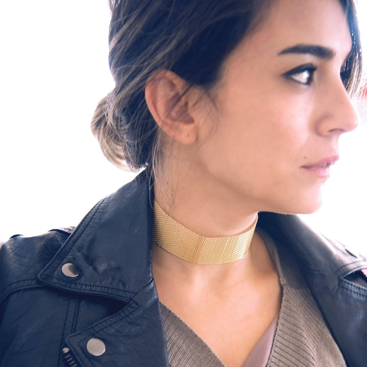 This choker necklace is made from hand-braided 24K gold-filled brass wire mesh. It measures 38 cm (15 inches) with a 4 cm (1.5 inches) extension.