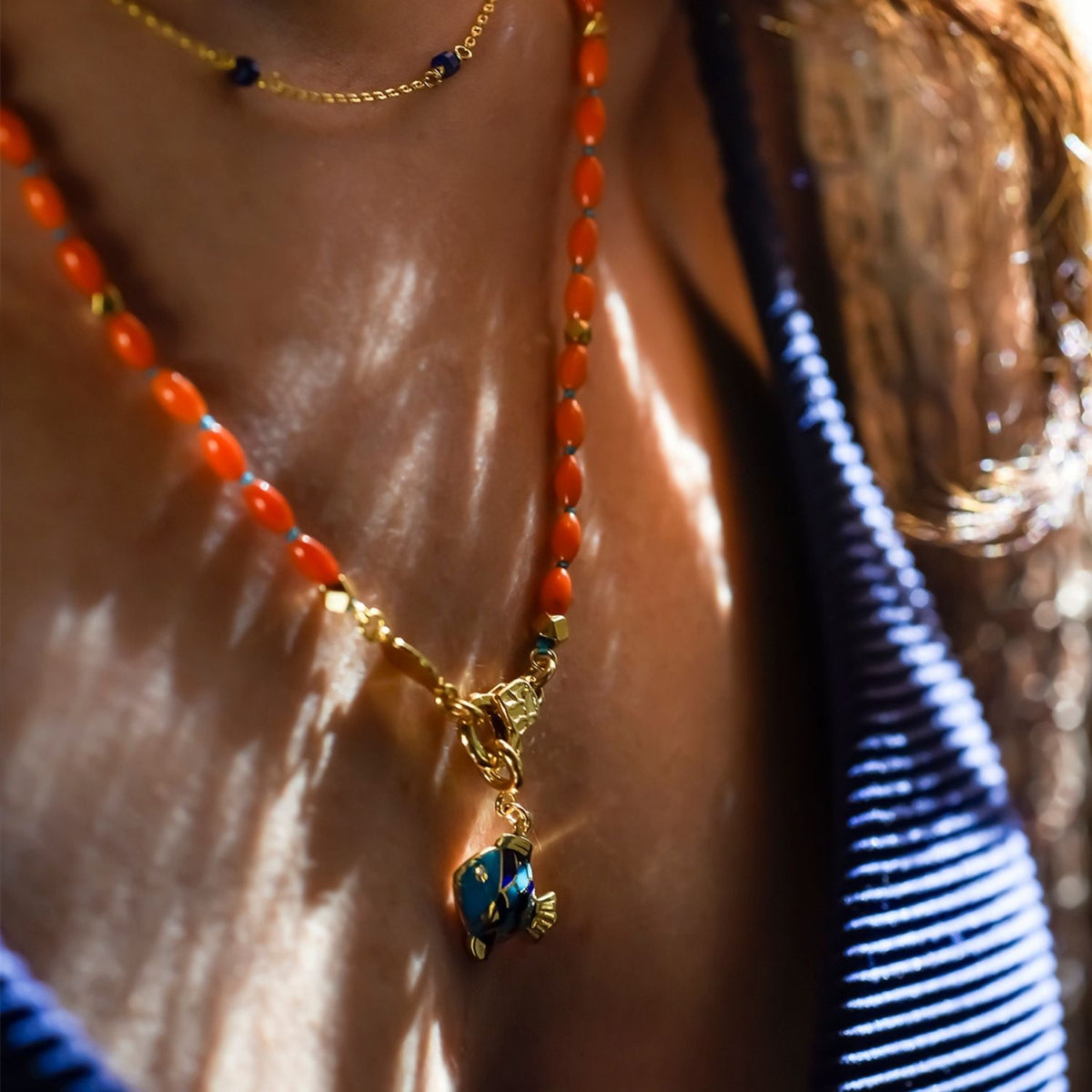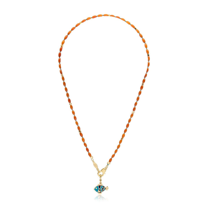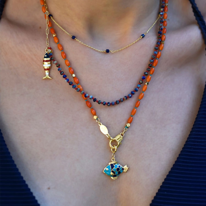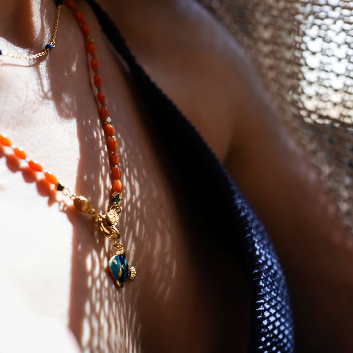 This necklace is made with natural coral beads, 24K gold-filled brass connectors, and a vibrant enamel-colored fish charm. It measures 55 cm in length.