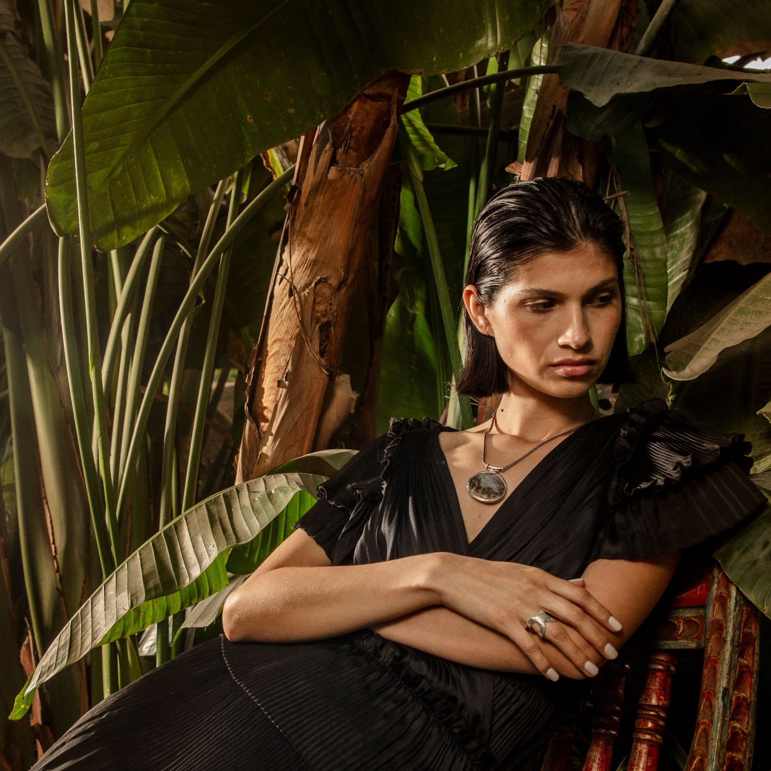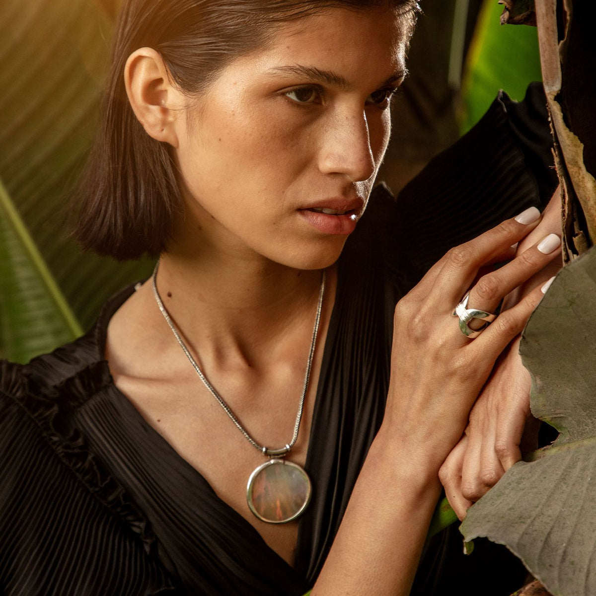 The Ari Necklace by Atelier Zelmira is a stunning statement piece that symbolizes affirmation and positivity. It features sterling silver and sustainably sourced mother of pearl shell from Cabo Blanco. Handcrafted with care, this versatile necklace can be worn with the shell facing front or back, and its purchase supports an ocean conservation project in Peru.
