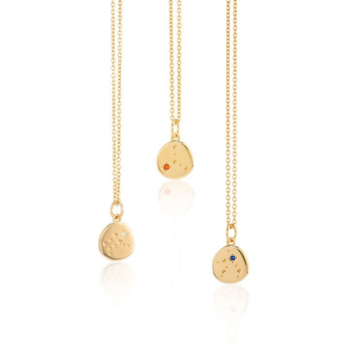 Materials: This pendant is crafted from 18ct gold vermeil and features precious gemstones that form the Leo zodiac sign. The pendant hangs on a 16-18" adjustable trace chain and includes a gold star charm. The piece is made with recycled silver.